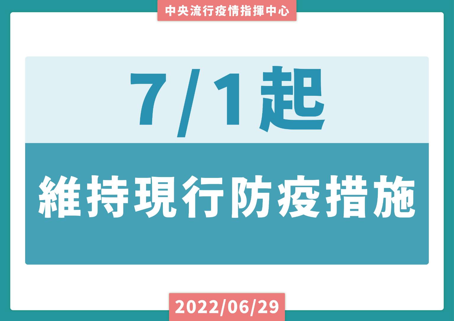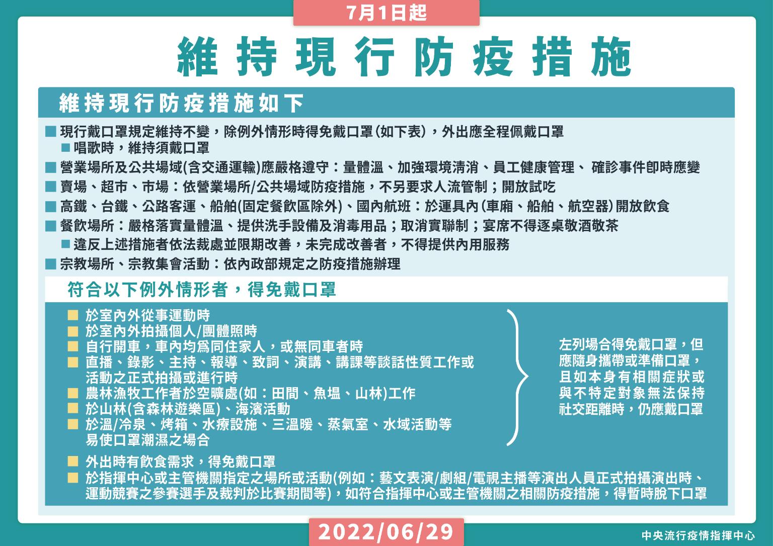 中央流行疫情指揮中心今日宣布,考量全臺已進入大規模流行階段,且境外移入BA.4及BA.5病例數持續增加,為兼顧防疫、經濟及社會運作,維持國內防疫量能與有效控管風險,經綜合評估疫情情勢,7月1日起維持現行戴口罩等防疫措施,相關規定說明如下: