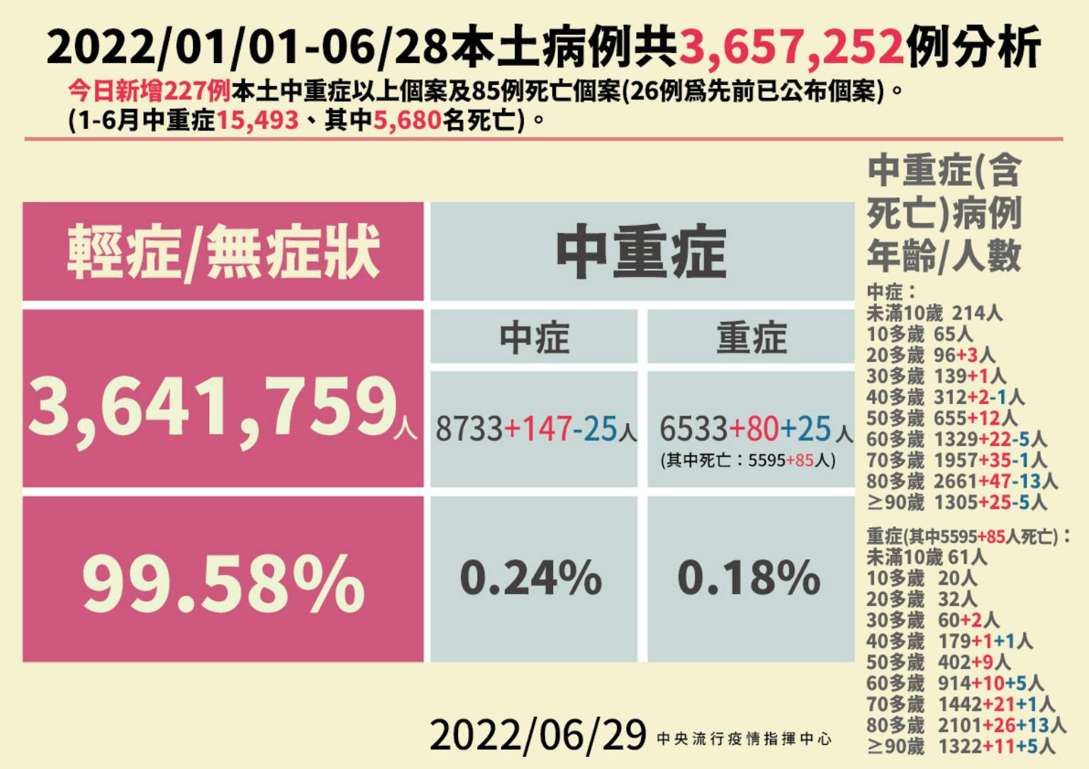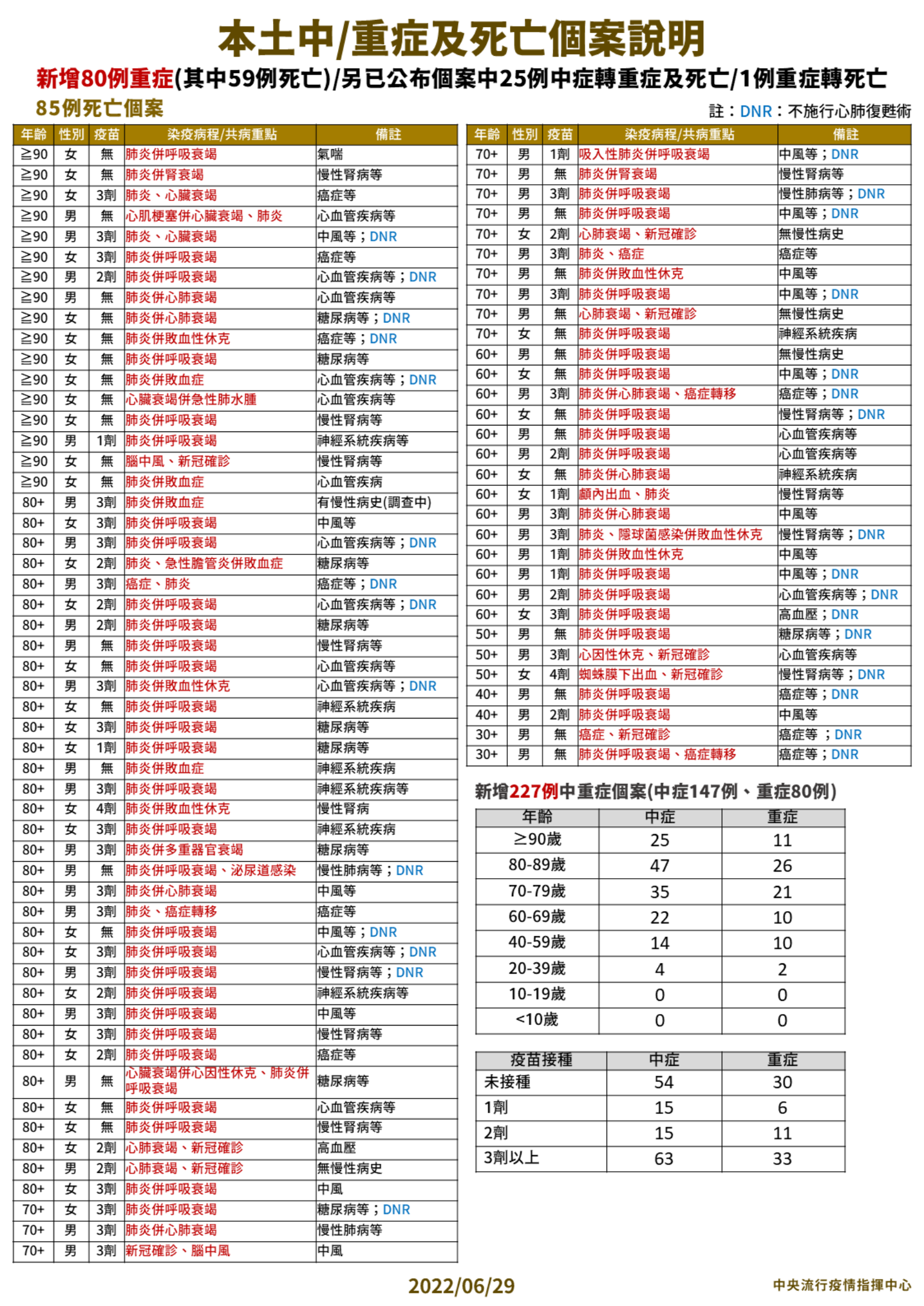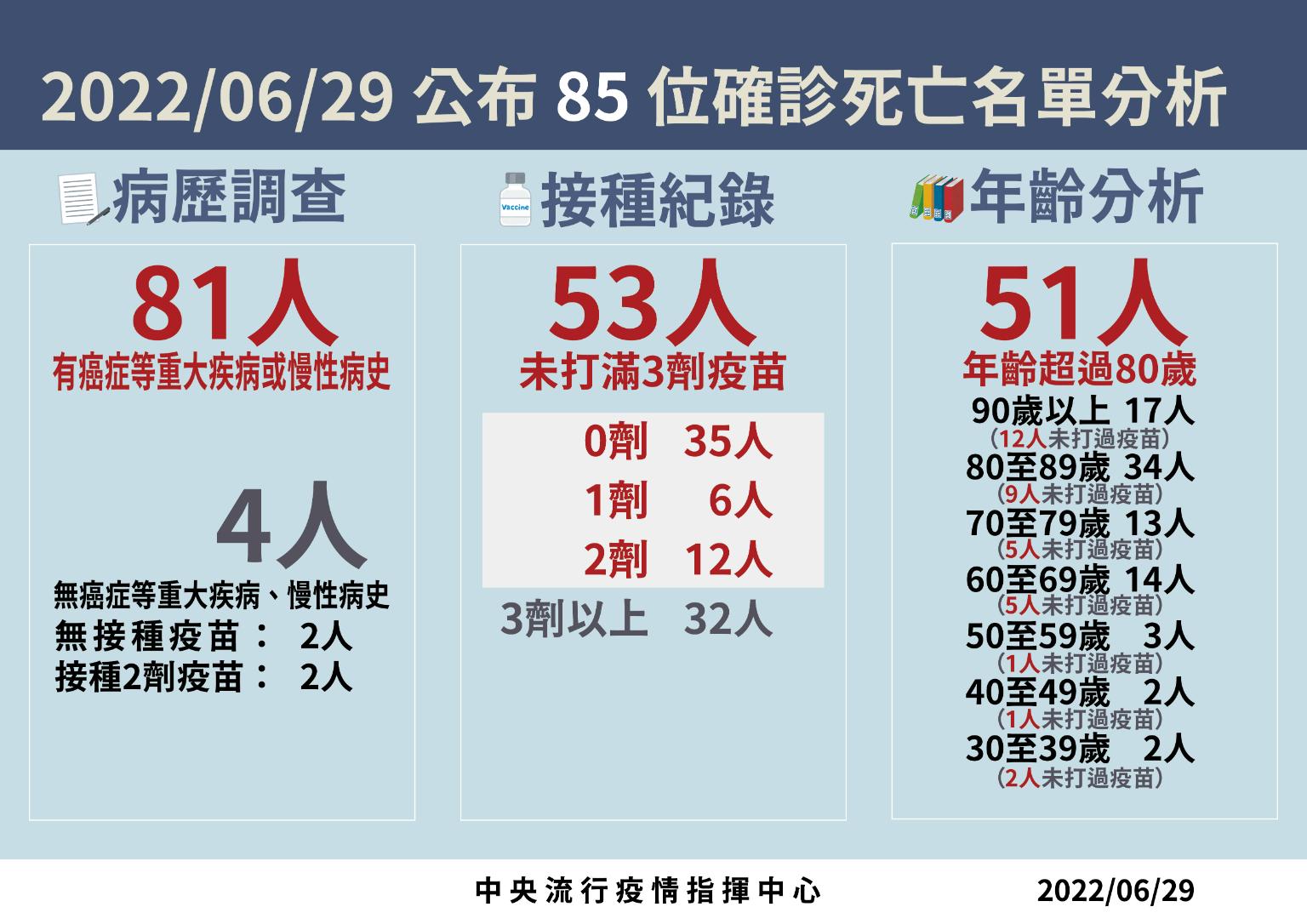 指揮中心指出,今日新增85例本土病例死亡個案,為46例男性、39例女性,年齡介於30多歲至90多歲以上,皆屬重度感染個案、81例具慢性病史、53例未接種3劑 COVID-19疫苗。確診日介於今(2022)年5月24日至6月26日,死亡日期介於5月27日至6月26日,詳如新聞稿附件。