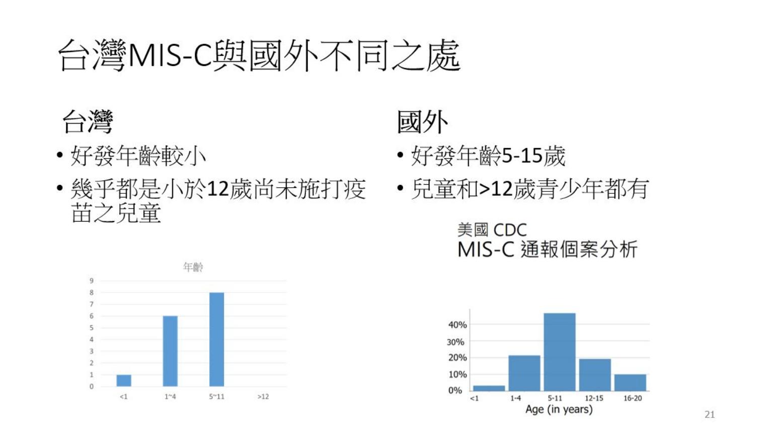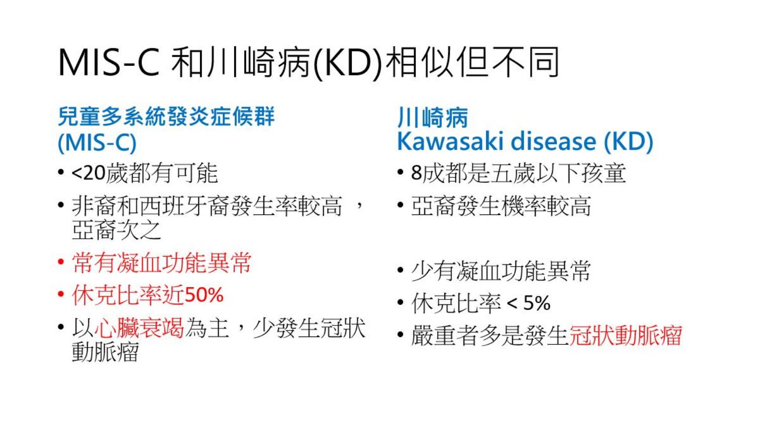 她表示,MIS-C表現類似川崎症但不完全一樣,「MIS-C小於20歲都有可能發生、常有凝血功能異常,休克比率近50%;川崎症則是8成都是5歲以下孩童,少有凝血功能異常,且休克比率<5%。」
