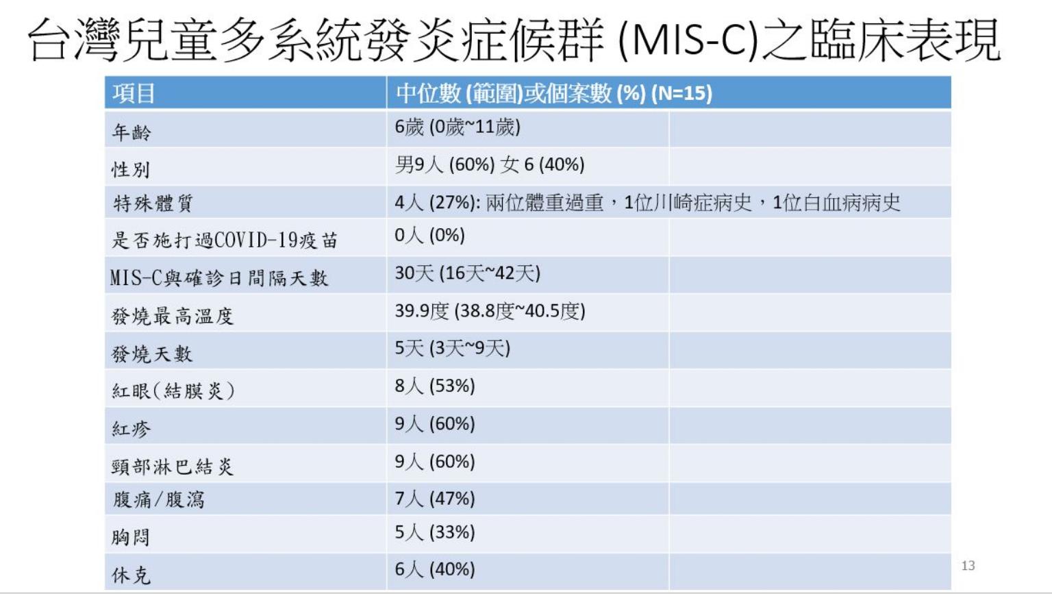 對此指揮中心於下午記者會中回應表示,指揮中心公告的15例MIS-C個案都是認定屬於重症,不代表整個病程變化輕中重情形,內部會再就MIS-C分類討論。