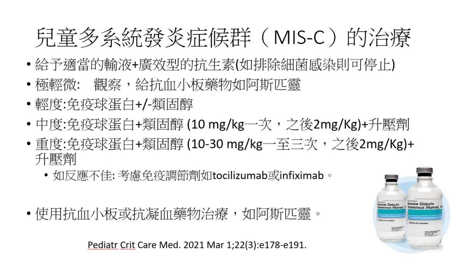 而MIS-C的治療主要是用免疫球蛋白合併類固醇,「一開始無法排除嚴重細菌感染,也會使用廣效型的抗生素,如果有休克的表現,同時間會使用升壓劑。若治療反應不佳便會考慮加上免疫調節劑如tocilizumab或infliximab。」張鑾英也提到,後續也會使用抗血小板或抗凝血藥物治療,如阿斯匹靈,而之後病童的心臟、體能及心理追蹤和支持也很重要。