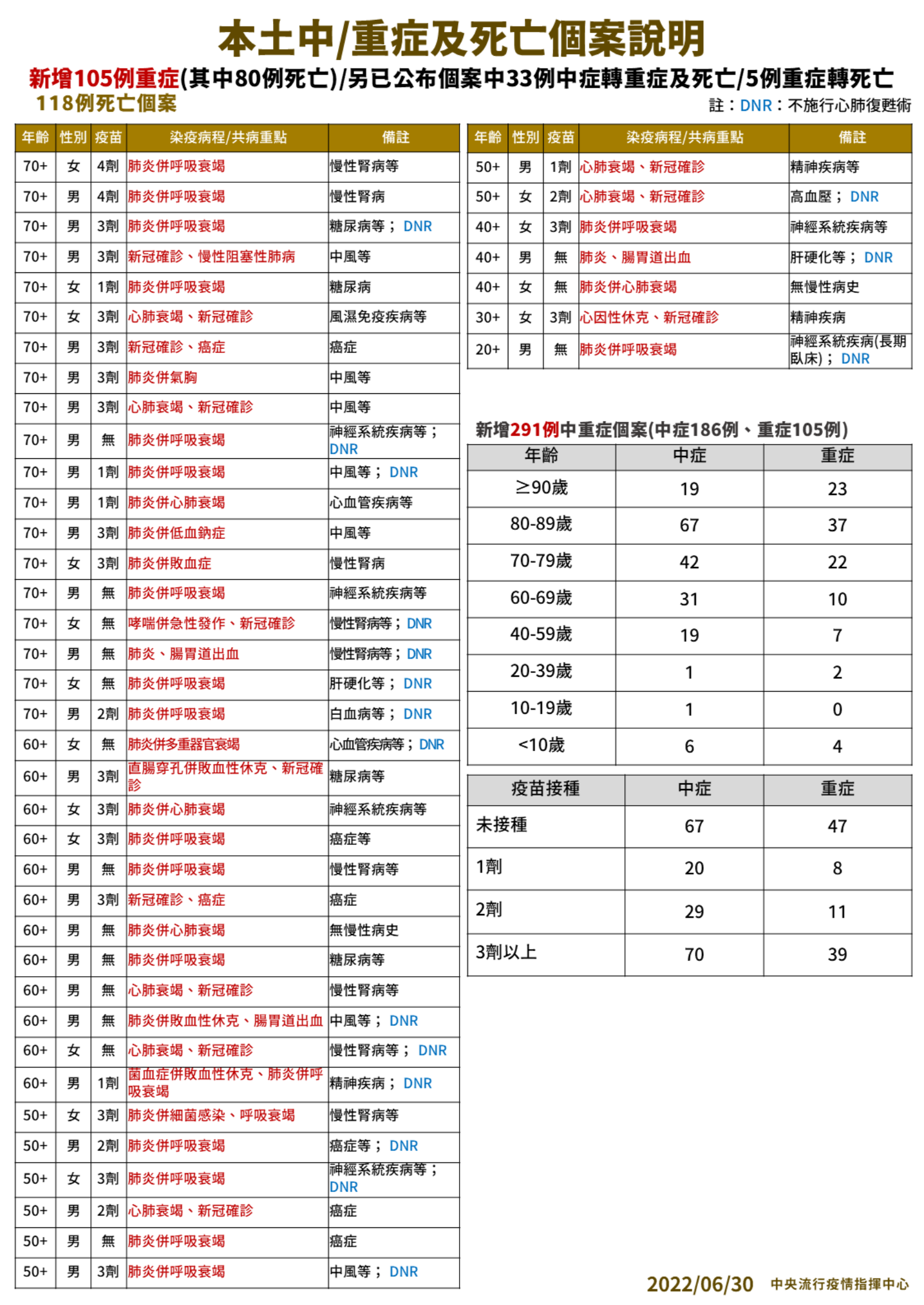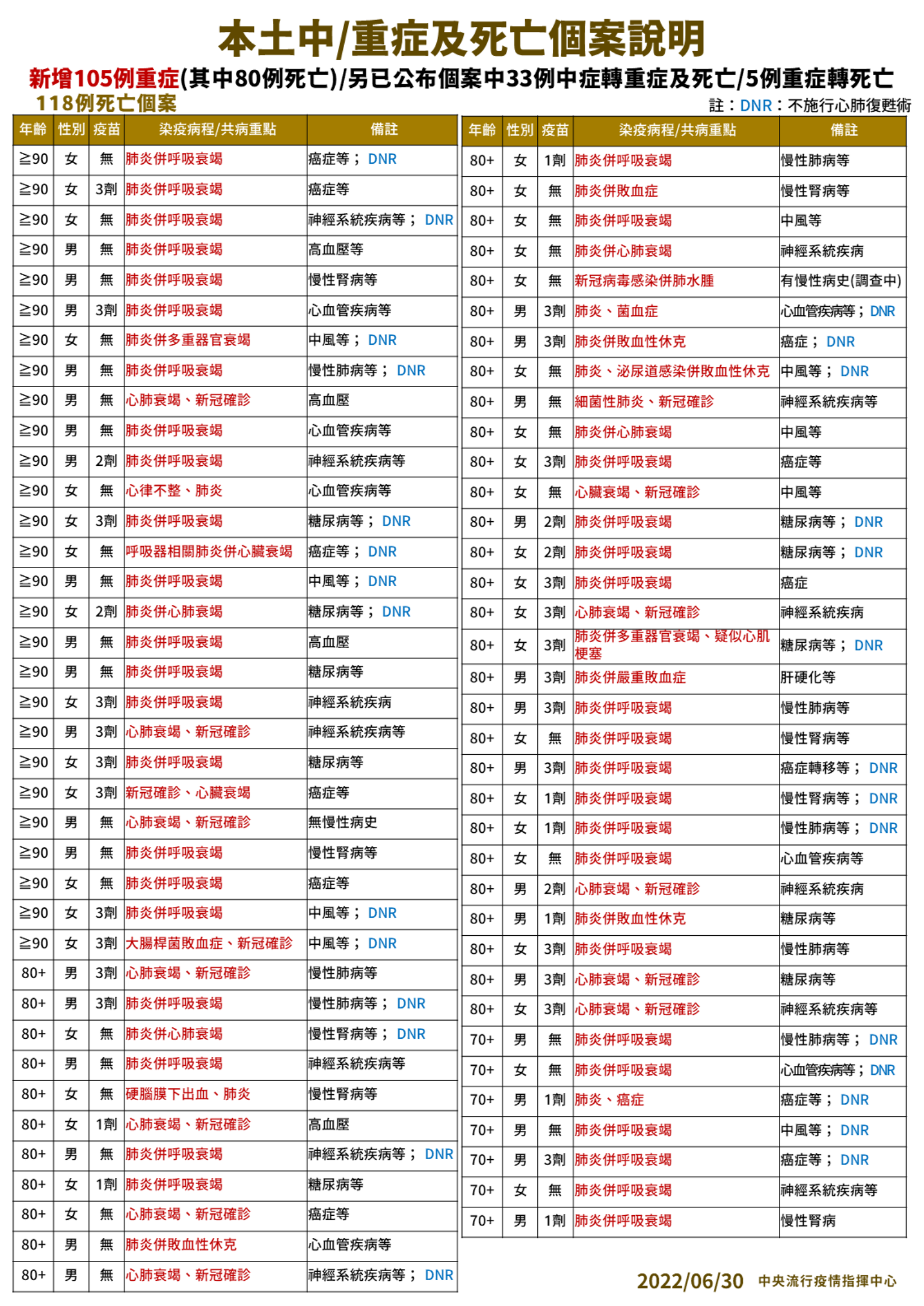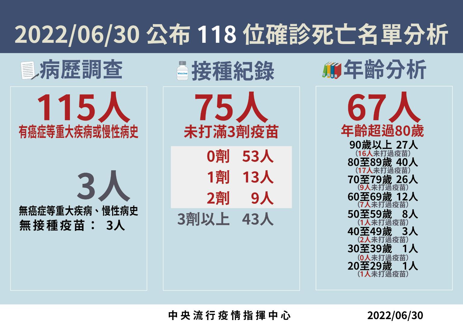 指揮中心指出,今日新增118例本土病例死亡個案,為62例男性、56例女性,年齡介於20多歲至90多歲以上,皆屬重度感染個案、115例具慢性病史、75例未接種3劑 COVID-19疫苗。確診日介於今(2022)年4月29日至6月27日,死亡日期介於5月24日至6月27日。