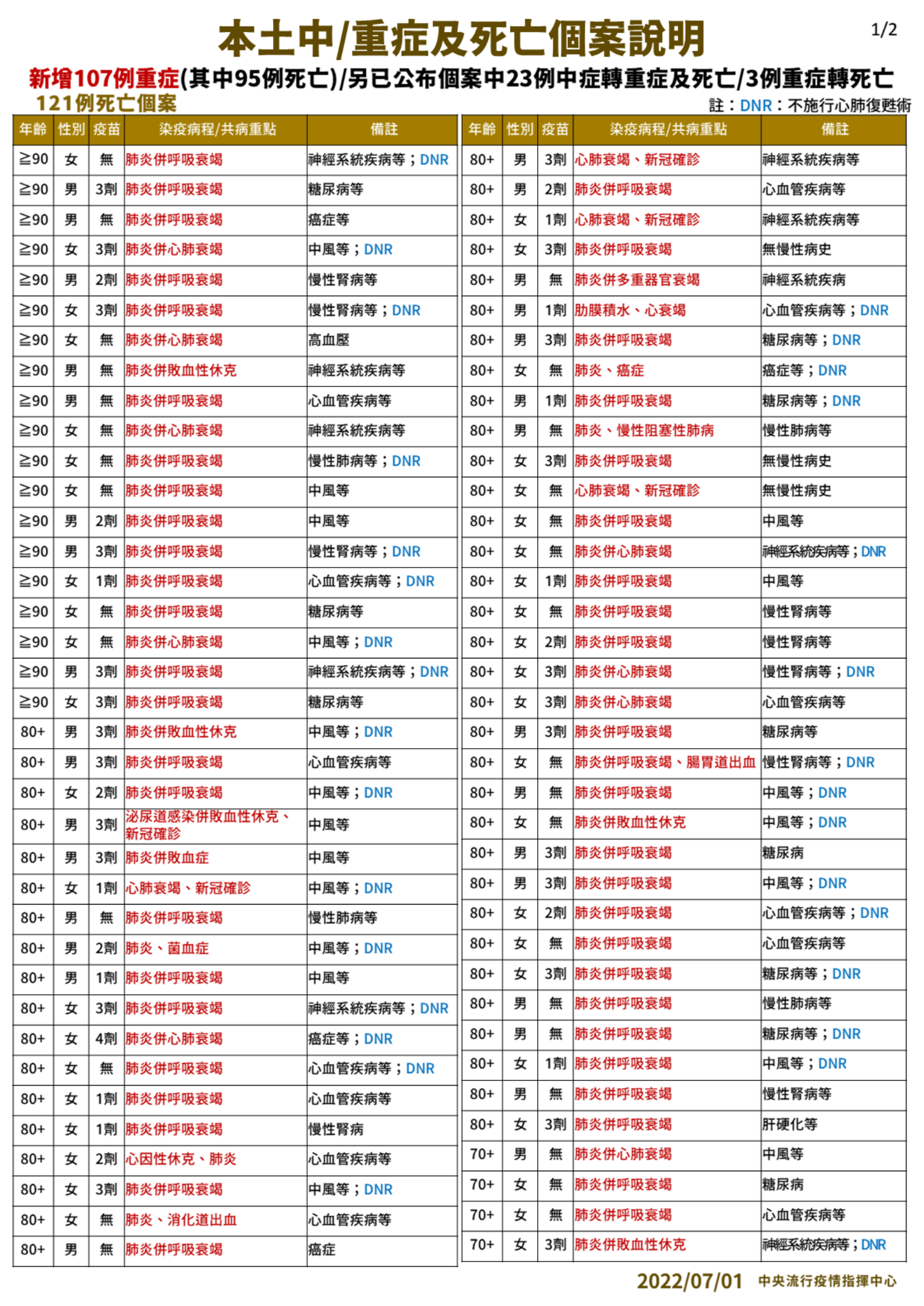 指揮中心指出,今日新增121例本土病例死亡個案,為63例男性、58例女性,年齡介於10多歲至90多歲以上,皆屬重度感染個案、116例具慢性病史、83例未接種3劑 COVID-19疫苗。確診日介於今(2022)年5月18日至6月28日,死亡日期介於5月11日至6月28日。