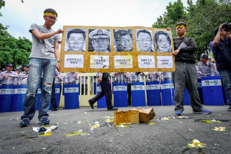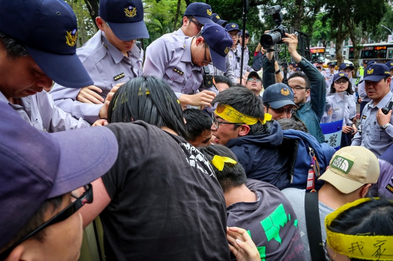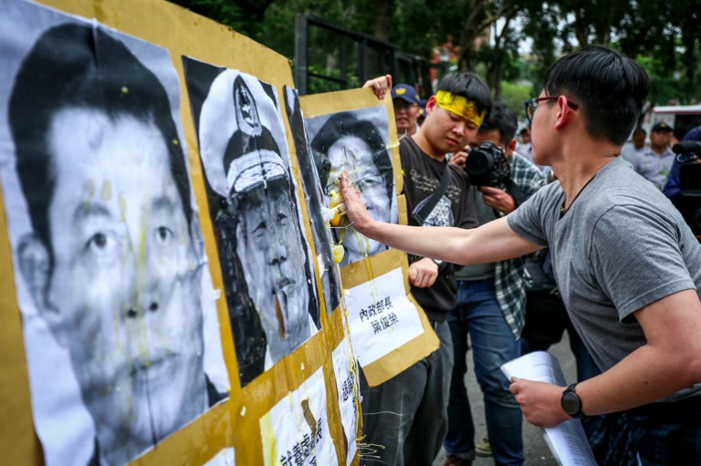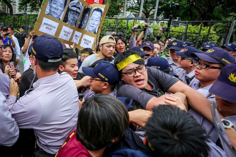 然而面對自救會今天的訴求,行政院代表僅回應已知道民眾的陳情,並會帶回行政院做相關討論,無法立即做出回應與承諾,引起現場抗議民眾不滿,試圖翻躍大門進入行政院,與警方爆發數波推擠衝突,最終在優勢警力壓制下才放棄翻躍行動。最後抗議群眾在行政院門口,以雞蛋丟擲有內政部長、退輔會主委、板橋榮家主任等相關主管之人像看板表達不滿。