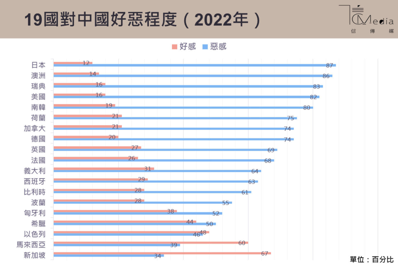美國智庫皮尤研究中心(Pew Research Center)近日發布最新各國對中國觀感調查,日本、澳洲、瑞典依然高踞「最討厭中國」前三名。