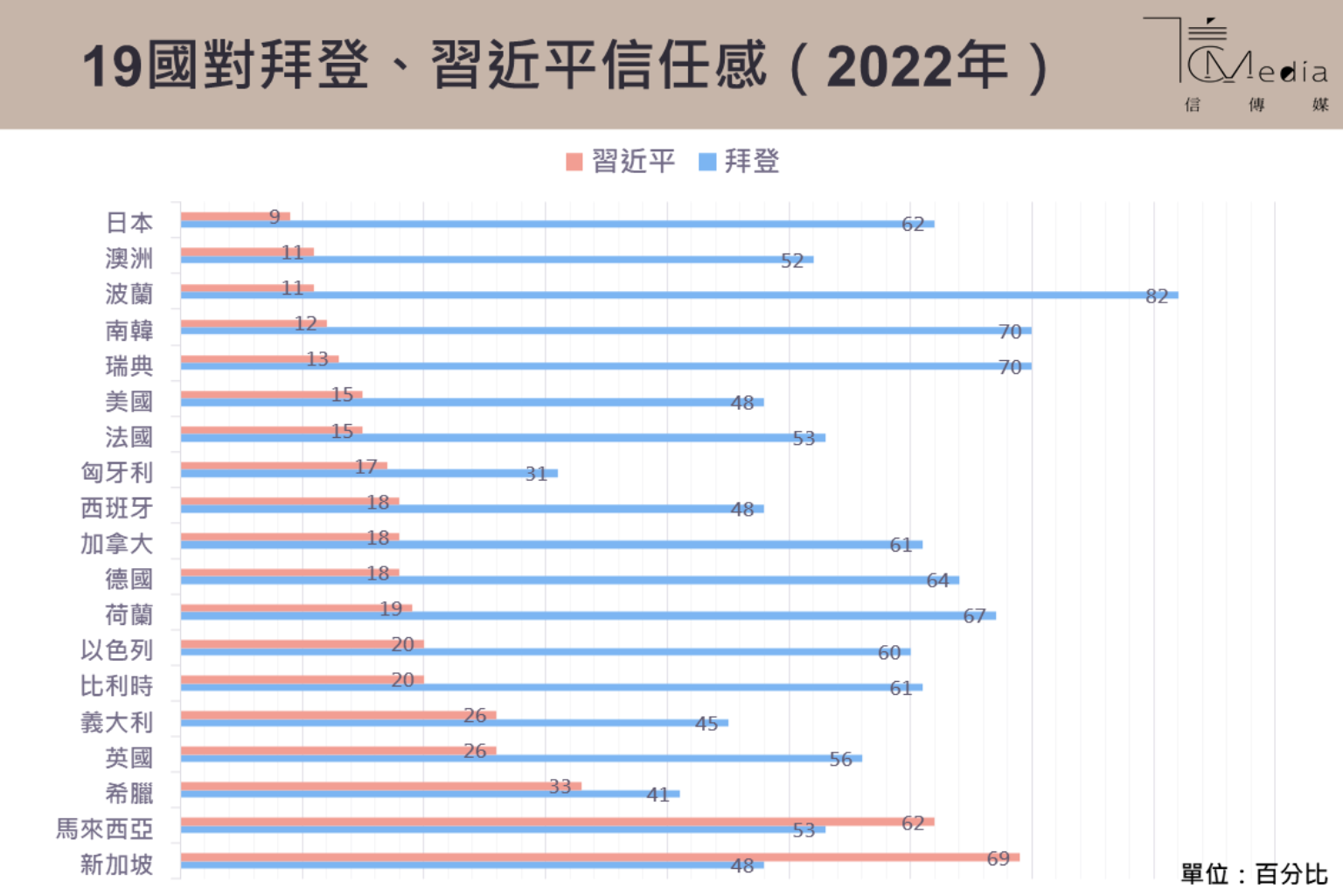 其結果與上述美中好感度相似,大部分國家較信任拜登而非習近平,唯二例外則是新加坡和馬來西亞。