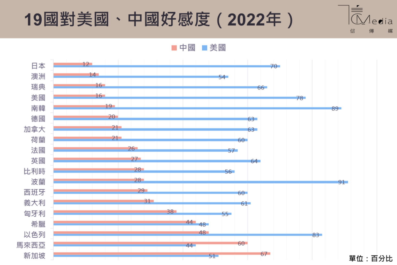 皮尤研究中心本次調查北美、歐洲、印太、中東共19國民眾對美國、中國看法,發現平均而言,對美國有好感者佔63.8%,中國則是29.7%。