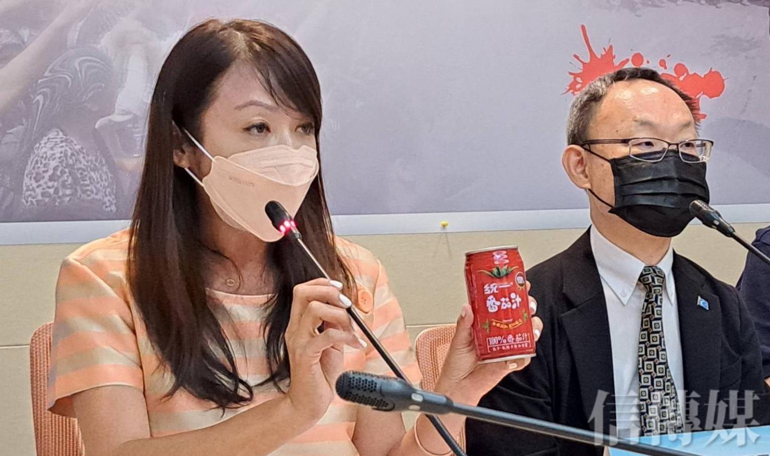 台北市議員許淑華拿出一罐「統一番茄汁」,指一些台灣企業仍標榜「使用新疆番茄」,他們無意針對特定公司,但台企必須負起自身社會責任,全面檢視其中國產業鏈。