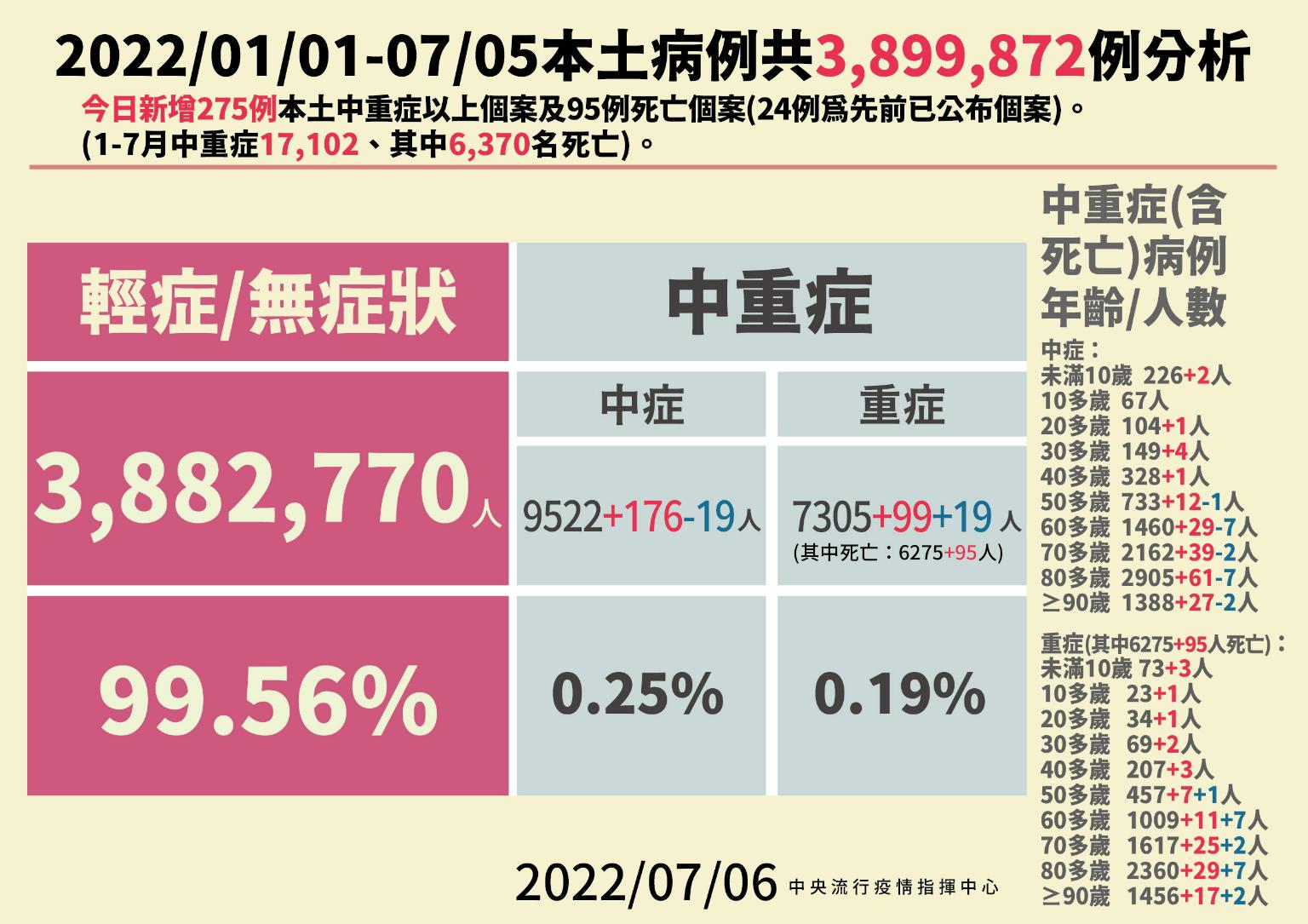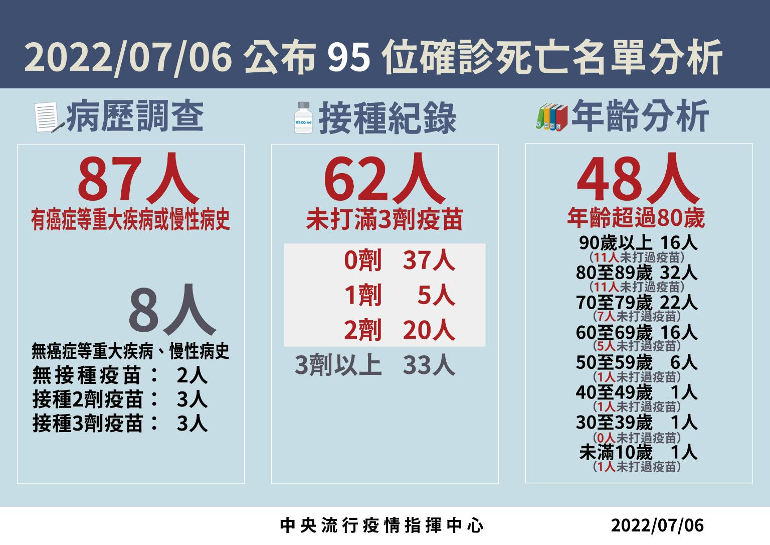指揮中心指出,今日新增95例本土病例死亡個案,為52例男性、43例女性,年齡介於未滿5歲至90多歲以上,皆屬重度感染個案、87例具慢性病史、62例未接種3劑 COVID-19疫苗。確診日介於今(2022)年5月7日至7月3日,死亡日期介於5月24日至7月3日,詳如新聞稿附件。