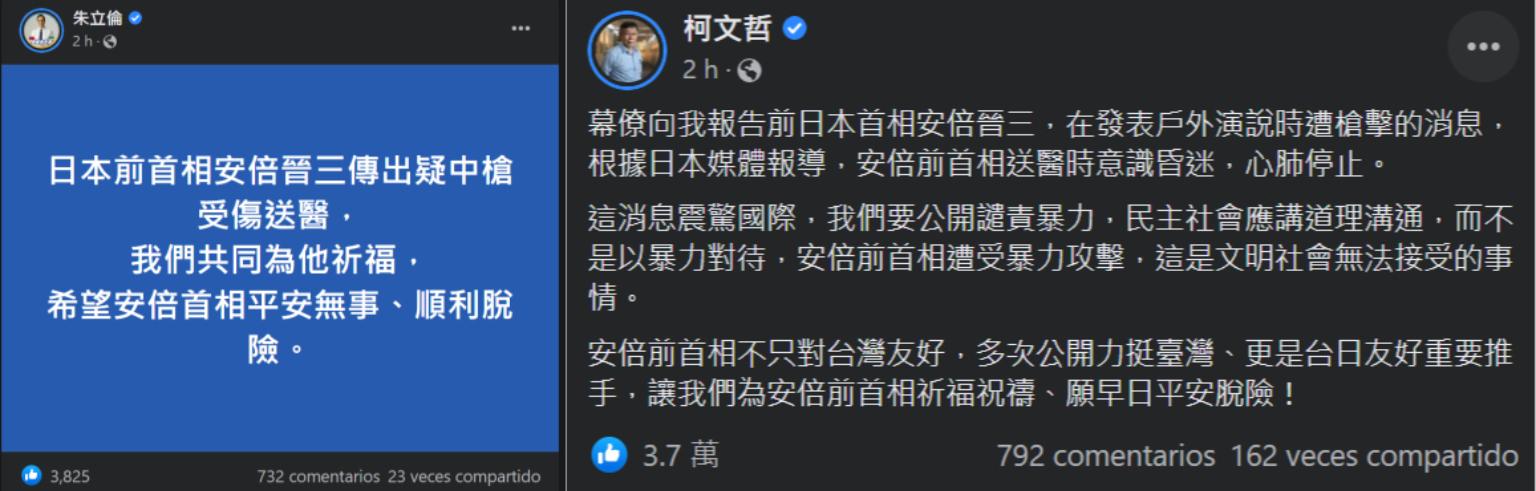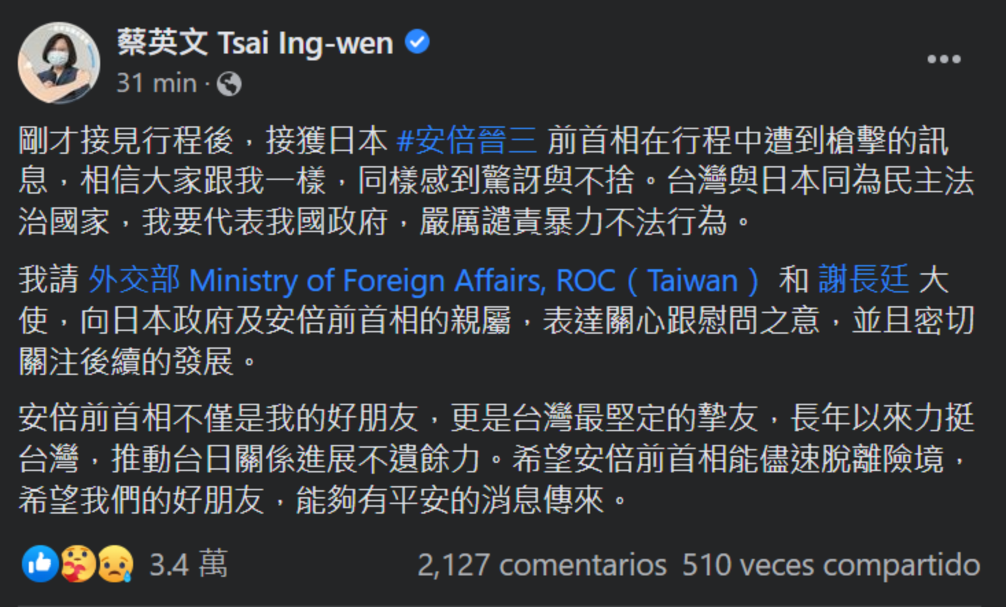 「感到驚訝與不捨」總統蔡英文在臉書肯定安倍「不僅是我的好朋友,更是台灣最堅定的摯友」,她向日本政府及安倍的親屬表達關心和慰問之意,同時代表台灣嚴厲譴責暴力不法行為。