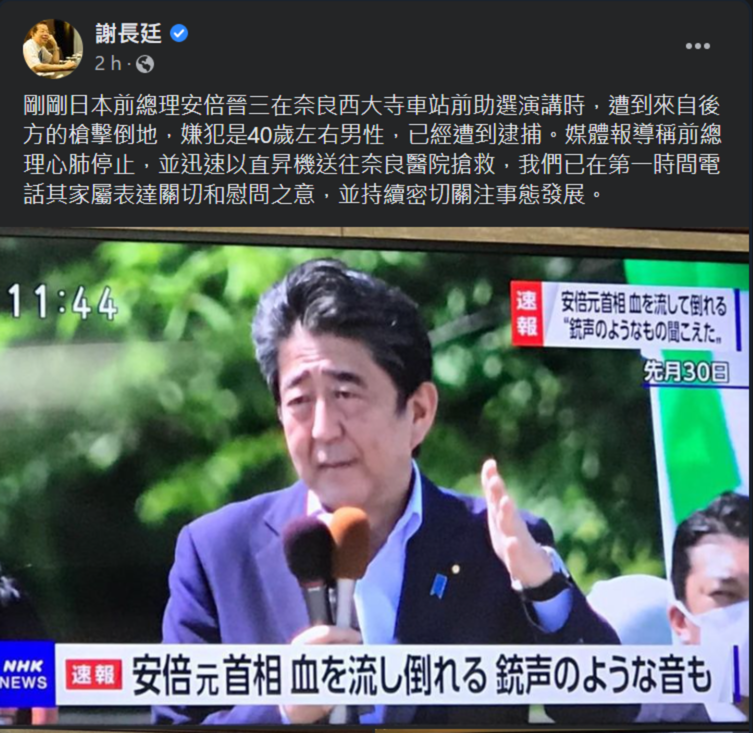 副總統賴清德在推特用日文為安倍加油打氣,駐日代表謝長廷也在第一時間代表台灣獻上慰問。