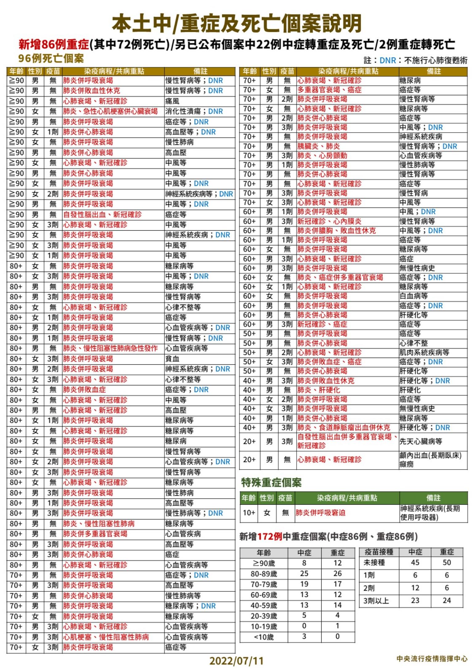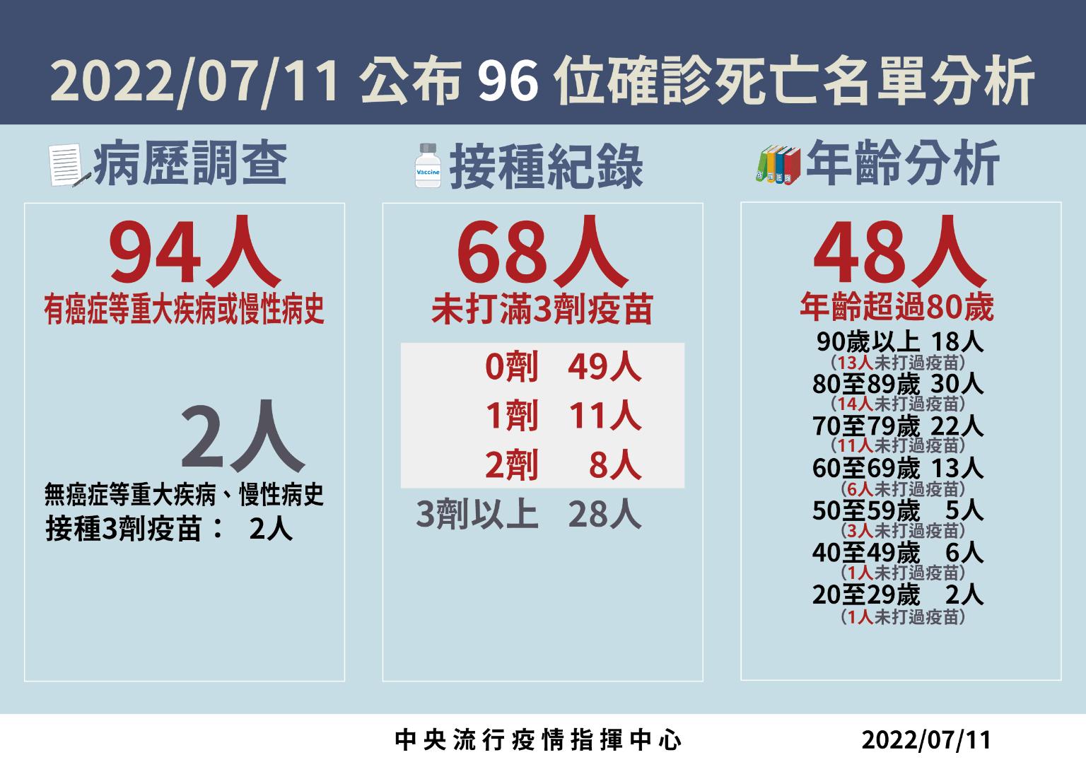 指揮中心指出,今日新增96例本土病例死亡個案,為59例男性、37例女性,年齡介於20多歲至90多歲以上,皆屬重度感染個案、94例具慢性病史、68例未接種3劑 COVID-19疫苗。確診日介於今(2022)年5月7日至7月9日,死亡日期介於5月25日至7月8日,詳如新聞稿附件。