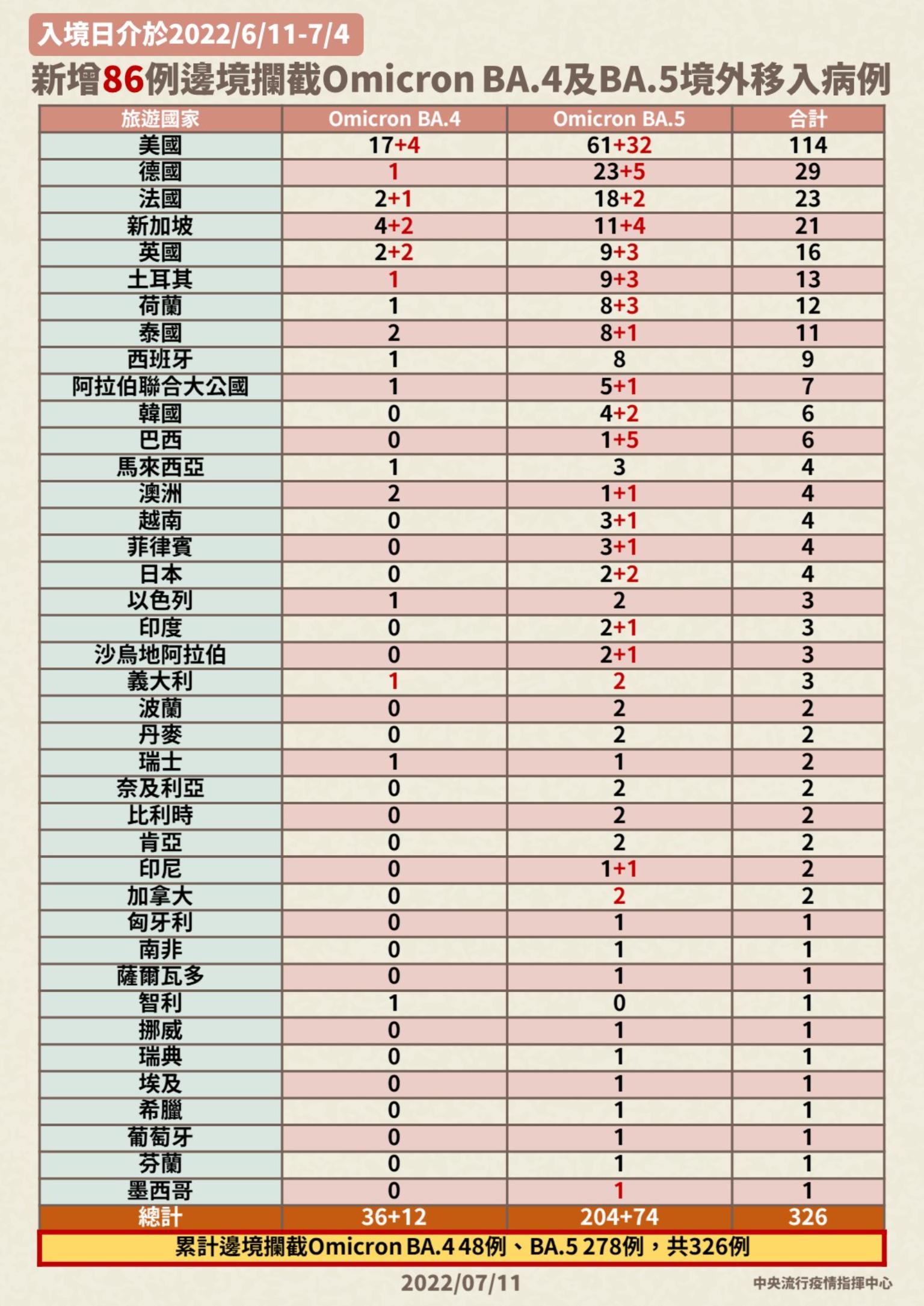指揮中心表示,國內境外移入個案中新增檢出12株Omicron BA.4及74株Omicron BA.5,個案分別為50例男性、36例女性,年齡介於未滿5歲至70多歲,入境日介於今年6月11日至7月4日。其中檢出Omicron BA.4個案分別自美國(4例),新加坡及英國(各2例),德國、義大利、法國及土耳其(各1例)移入;檢出Omicron BA.5個案分別自美國(32例),德國及巴西(各5例),新加坡(4例),英國、土耳其及荷蘭(各3例),義大利、法國、日本、韓國及加拿大(各2例),越南、沙烏地阿拉伯、印度、阿拉伯聯合大公國、菲律賓、澳大利亞、墨西哥、印尼及泰國(各1例)移入。