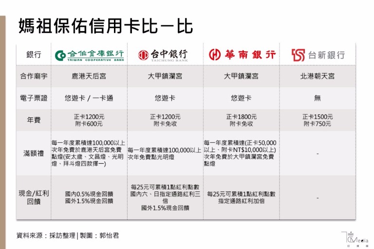 目前市場上四大媽祖認同卡分別是合庫銀行的鹿港天后宮、華南銀行與台中商銀和大甲鎮瀾宮的聯名卡及台新銀行的北港朝天宮認同卡,刷卡的現金回饋或者累計紅利點數和其他信用卡也差不多,但根據各家銀行內部主管透露,其實媽祖認同卡的發卡量並不高。