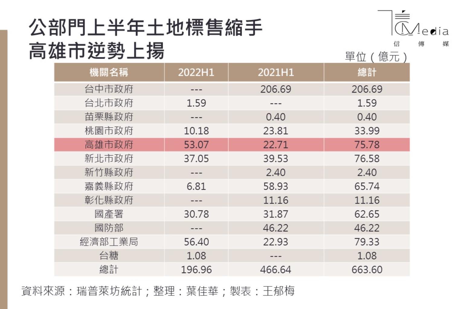 今(2022)年以來隨著高通膨、全球央行啟動升息、股市大跌等負面影響,投資風險大幅提高,連帶影響上半年土地交易量急縮,根據商仲業者統計,今年上半年整體土地交易總額僅約794億元,年減4成5,其中,公部門標售土地更是面臨腰斬,但有趣的是,高雄市政府上半年土地標售金額反而逆勢翻倍。
