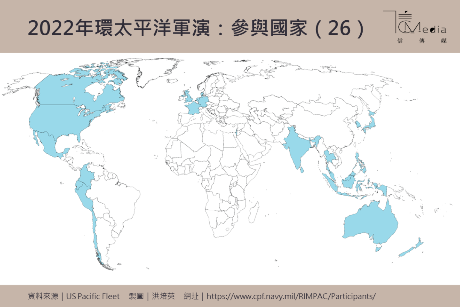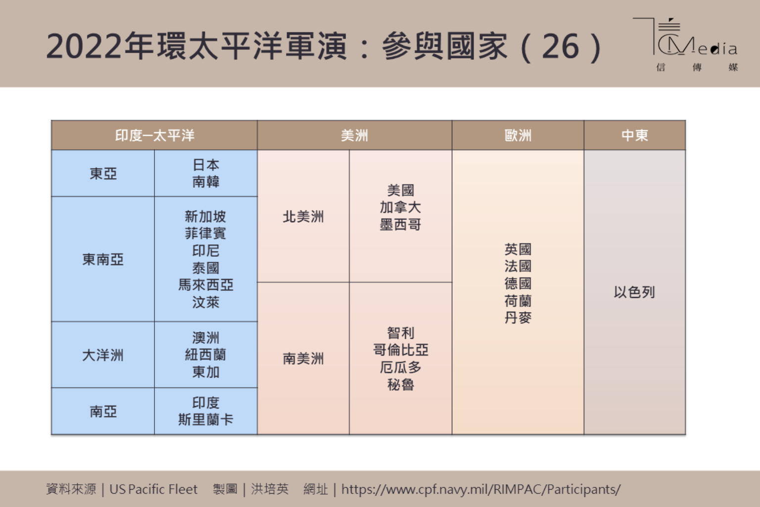 2022年有來自印太、美洲、歐洲和中東等26國參與RIMPAC,出席名單如下圖表: