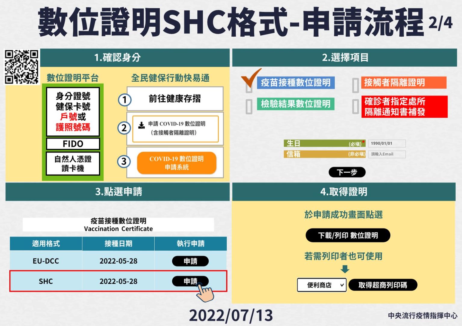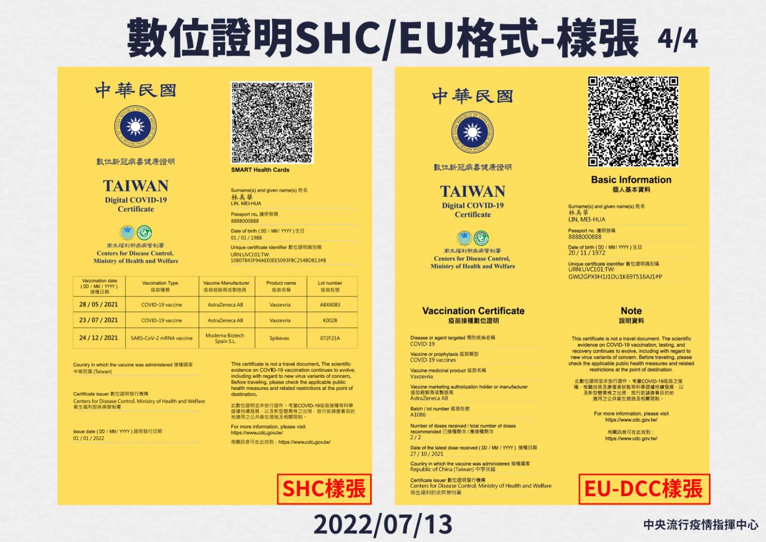 中央流行疫情指揮中心今(13)日表示,衛生福利部業於今(2022)年5月20日加入由美國為首的國際組織VCI(Vaccination Credential Initiative),故可發行 Smart Health Card(SHC)格式數位證明並取得認證,本次「數位新冠病毒健康證明」系統版本更新將新增核發SHC格式之數位證明功能,預計於今年7月14日上午8時完成,新增功能說明如下: