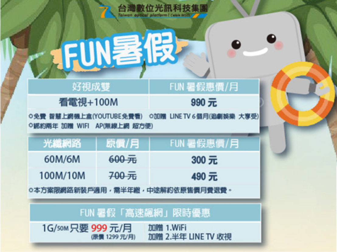 配合暑假,學生在家上網打遊戲,台數科家庭雲遊戲,月付199元即可享受價值2萬元的遊戲庫;另外1G寬頻上網也限時優惠每月僅999元,還送LINE TV收視半年,超值好康 。