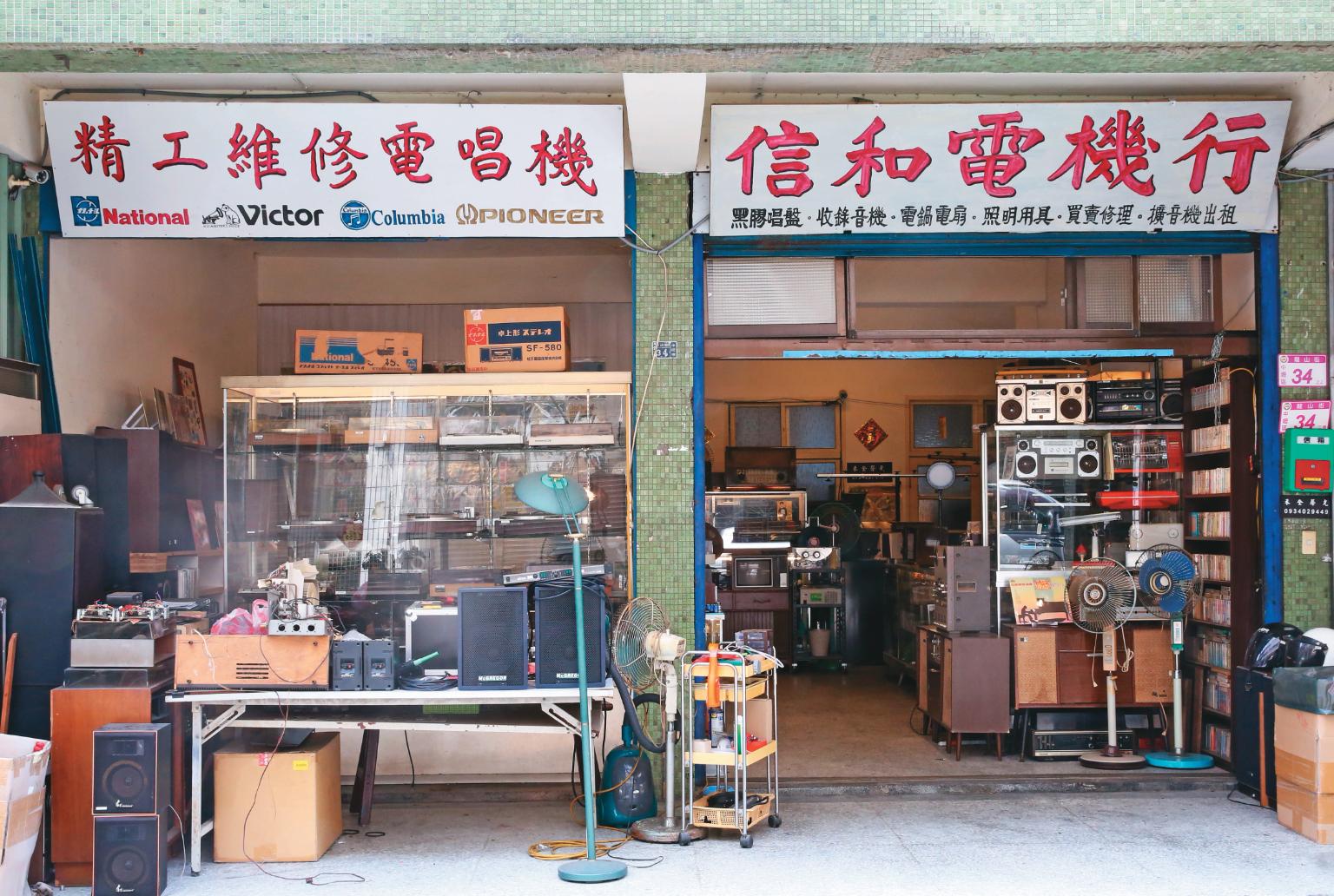 陳祈全善用從父輩學來的專業知識與維修技藝,大二起嘗試做起成音、音響出租生意,而後在中壢開設自己的店面,沿用老家店名「信和」掛起電機行的招牌。走進店裡,玻璃櫃陳列滿載歷史感的老電器,與老時鐘、唱片機、電扇、卡帶鋪染懷舊而溫暖的氛圍,「這就是我想像中的電機行,應該有的樣子。」