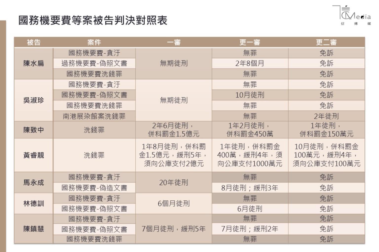 2012年最高法院再度撤銷更一審判決發回更審,2016年陳水扁以身體為由,聲請停止審判獲准,其他被告部分繼續審理,而在今年4月更二審開辯論庭後,陳水扁開記者大動作喊冤,民進黨也提案修《會計法》為國務機要費除罪化,今年5月底在衝突下,立法院三讀通過,高院在7月1日已裁定撤銷陳水扁停審裁定,此扁涉案部分今日一併宣判,其中國務機要費部分獲判免訴。