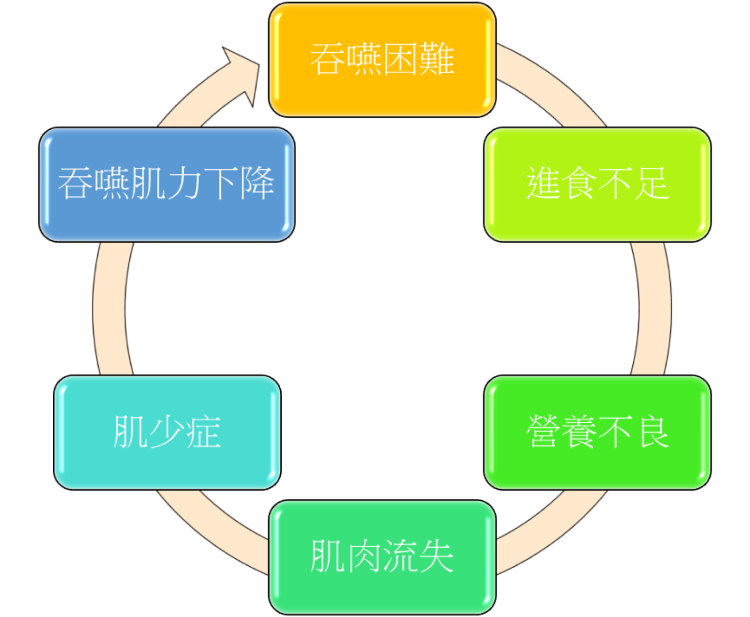 正常人能順利吞嚥,靠的是完善的神經系統下指令給口腔咽喉處的肌肉群,將食物咀嚼吞嚥後,運送至食道,來完成吞嚥。過去的研究發現隨著年紀增長,與吞嚥相關的肌肉質量會逐漸減少,這會讓吞嚥肌群的肌耐力下降,因此導致吞嚥困難。而吞嚥困難則會造成經口進食產生困難,導致對用餐及飲水產生畏懼,可能造成營養不良、肺炎、感染、呼吸困難,嚴重者會有生命危險。而營養攝取不足又會再進一步導致肌少症。這樣的情況形成惡性循環,使肌少症與吞嚥困難的情況愈來愈嚴重。(圖一)