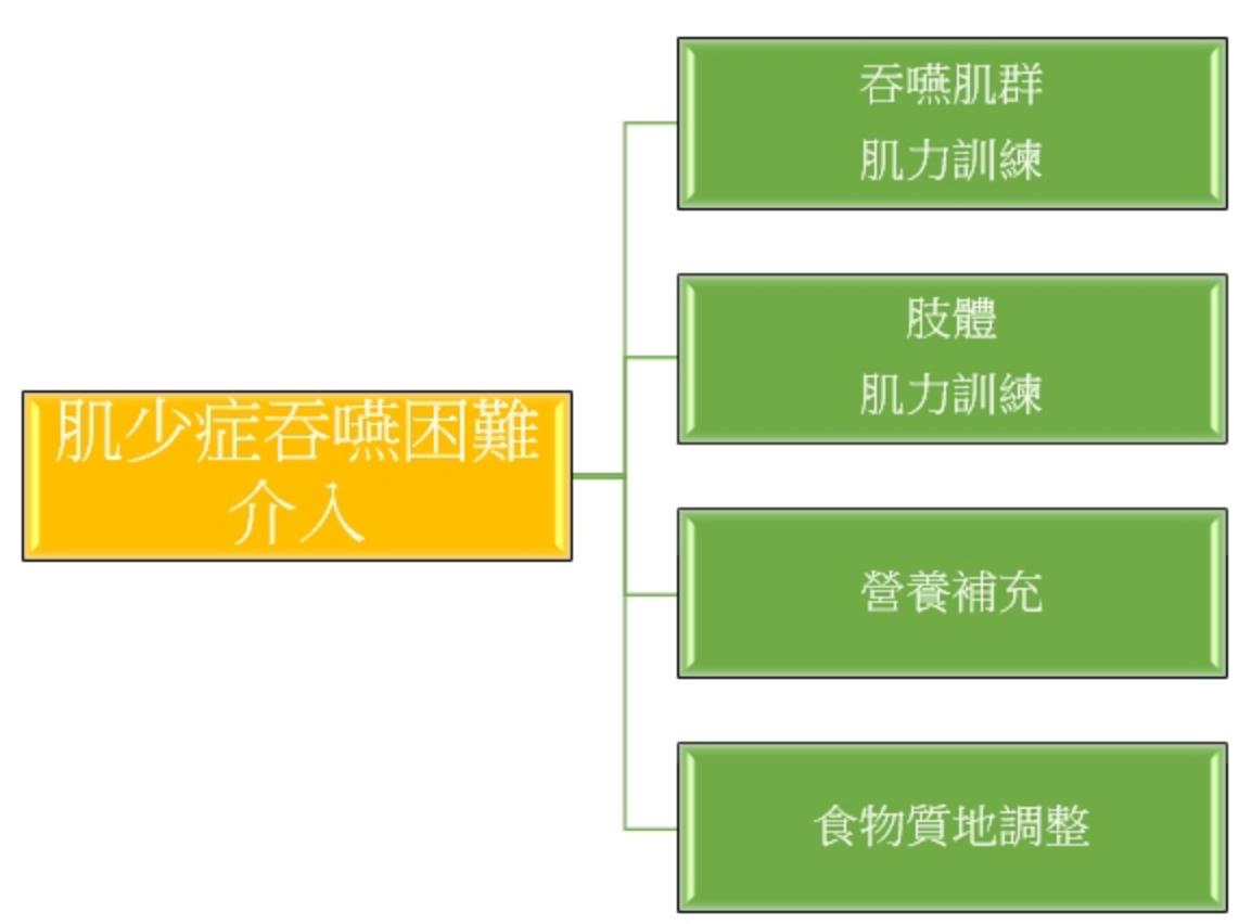 在評估肌少症吞嚥困難時,也會從肌肉質量、肌肉力量、行動功能表現等三個面向來評估有無肌少症,並依吞嚥困難的情況,來評估主要的原因是否為肌少症所導致,並根據評估結果進行吞嚥困難照顧。