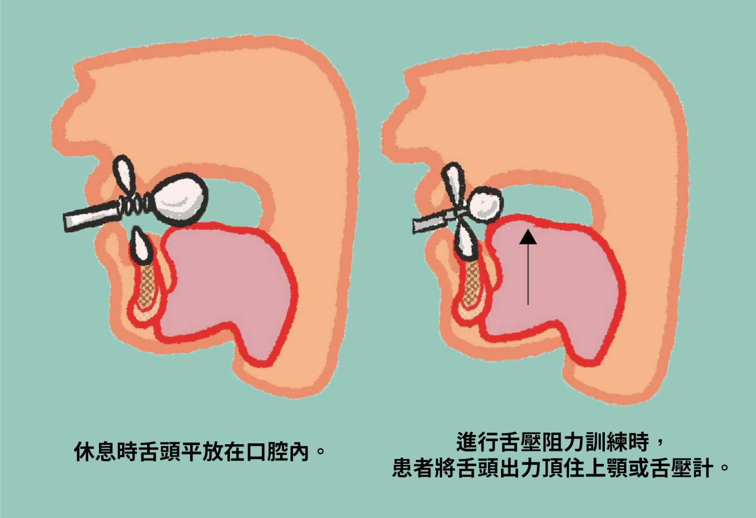 1.吞嚥肌群的訓練包含舌頭阻力訓練、吞嚥相關肌群阻力訓練及呼吸訓練,其中舌壓阻力訓練(Tongue-pressure resistance training, TPRT)是目前最適合使用在肌少症吞嚥困難的吞嚥肌群強化訓練方式,其作法為患者將舌頭出力頂住上顎10秒,然後在休息10秒,一組30次,一天2-3組,並可搭配舌壓測量給予回饋。藉由吞嚥肌群的阻力訓練,可以有效增進吞嚥肌力,促進吞嚥能力。