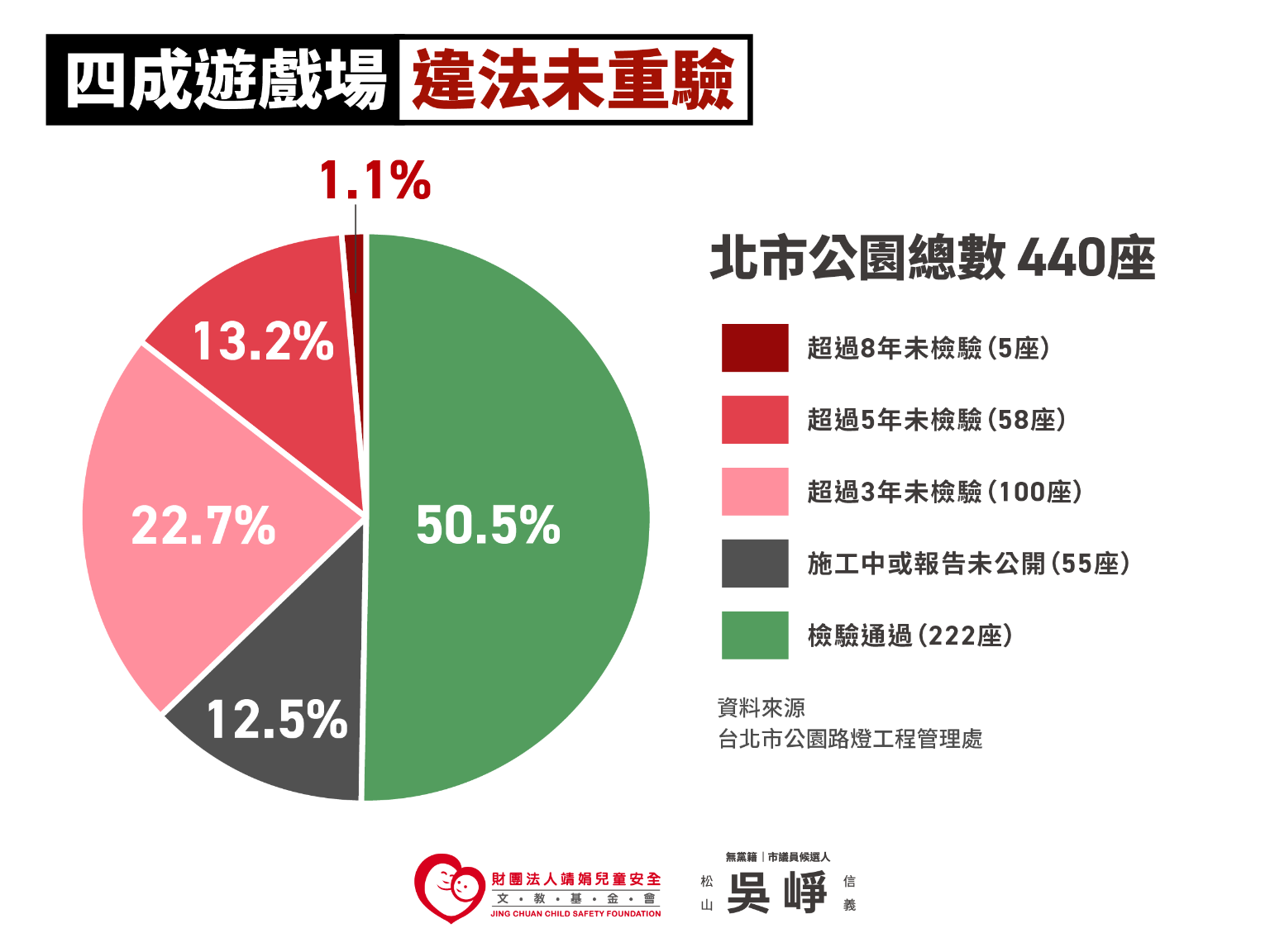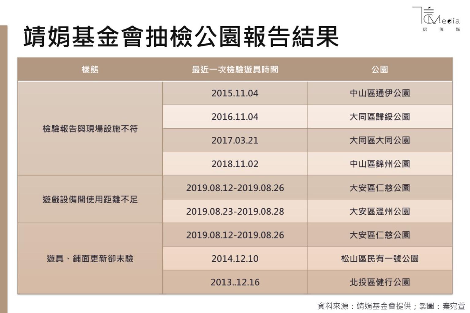 靖娟基金會檢視資料發現,台北市440座遊樂場有163座逾期未檢驗,此外還發現8座遊戲場報告根本與現場不符,要求北市公園處應依法完成檢驗,並全面清查檢驗報告,保障兒童安全。
