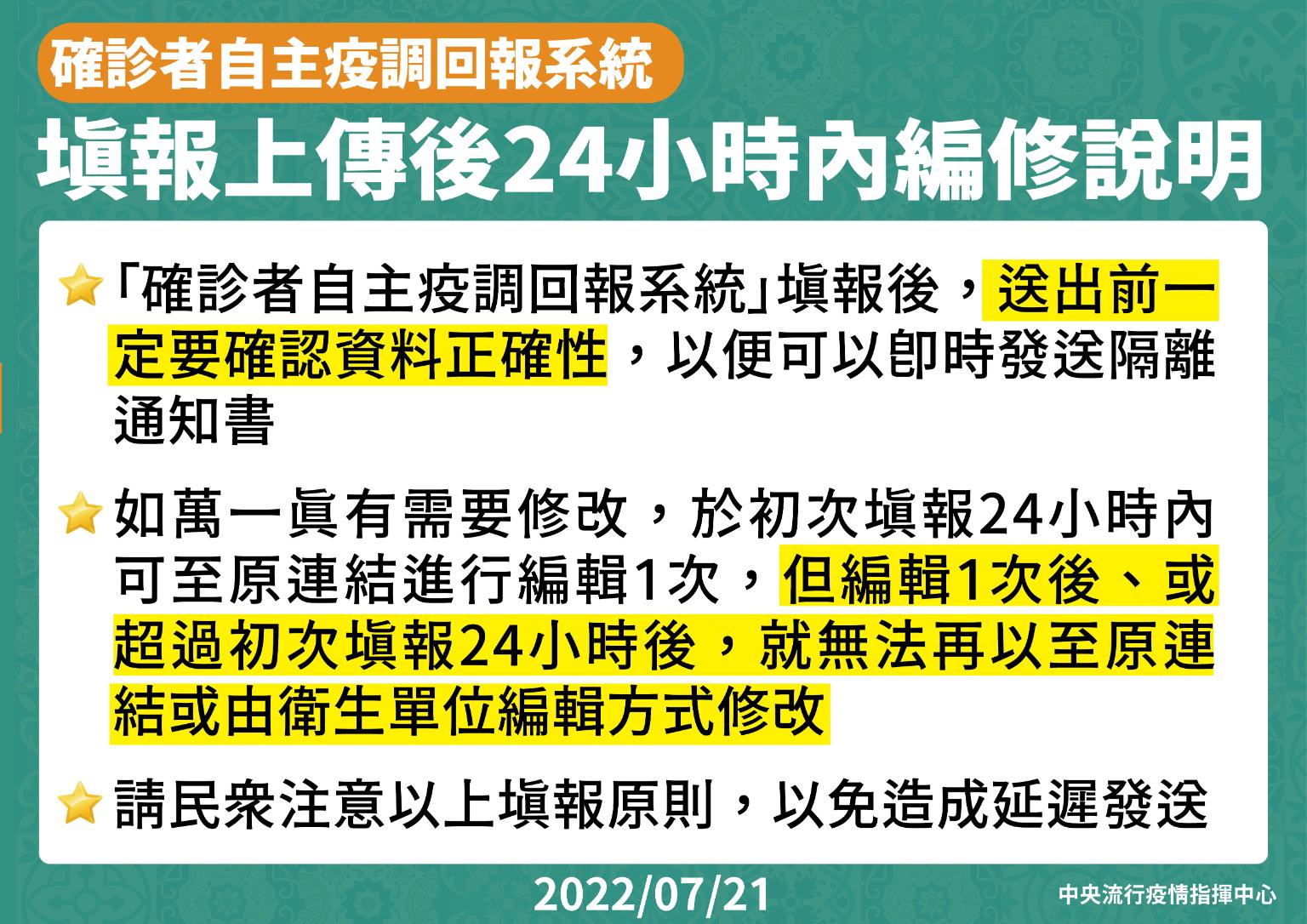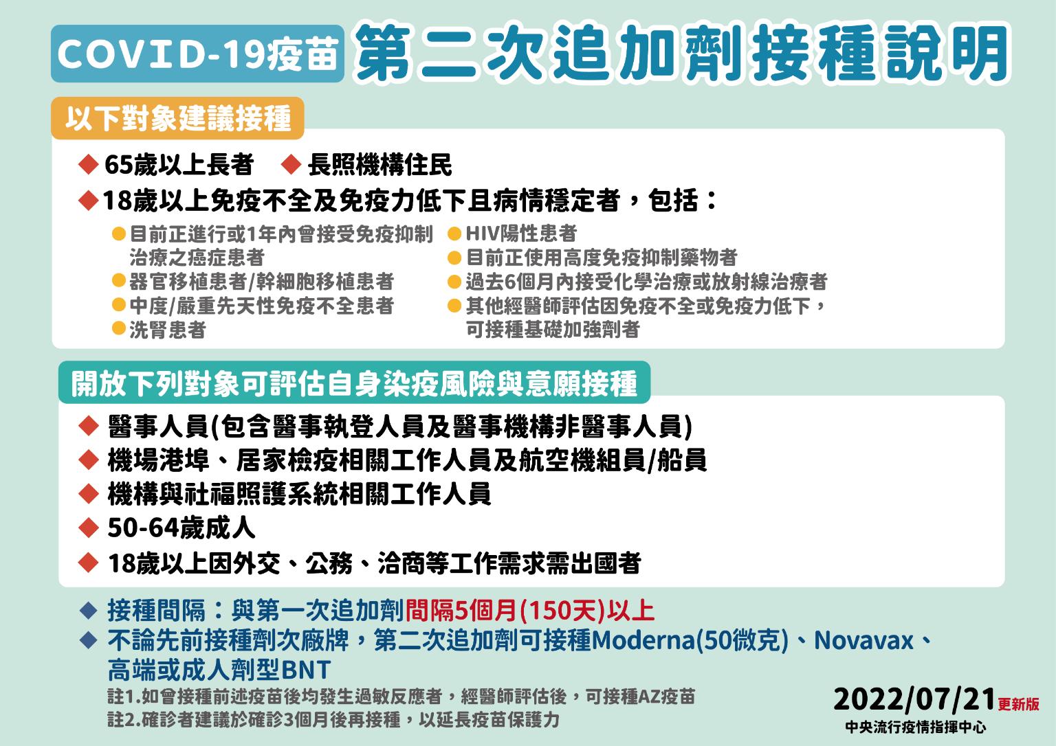 中央流行疫情指揮中心今日表示,目前國內疫情趨緩,邊境政策逐漸開放,惟考量國際疫情仍持續嚴峻,經書面諮詢衛生福利部傳染病防治諮詢會預防接種組(ACIP)意見並衡酌國內疫苗核准與供應現況,將自7月22日起,開放因工作需求需出國之18歲以上民眾接種第二次追加劑。