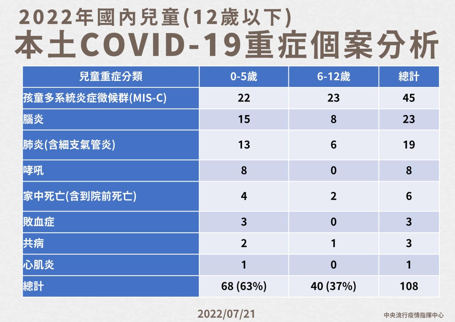 醫療應變組副組長羅一鈞指出,未滿5歲的兒童為一位3歲男童,本身有發展遲緩慢性的狀況,7月12號開始有發燒到40度,腹瀉,還有活力、食慾下降的形情,家人送至急診,在急診發現有血壓降低跟呼吸急促,有胸凹的現象,採檢PCR陽性確診COVID-19,於當日住院,病況有惡化的狀況,插管轉加護病房,使用呼吸器,給予瑞德西韋、免疫球蛋白等藥物,但不幸因為多重器官功能都有變差情形,7月17日過世,據死亡診斷記載,死因是急性心肌炎,以及有新冠病毒的感染,為首例12歲以下兒童染疫之後,併發急性心肌炎的病例,目前兒童死亡的病例是23名。