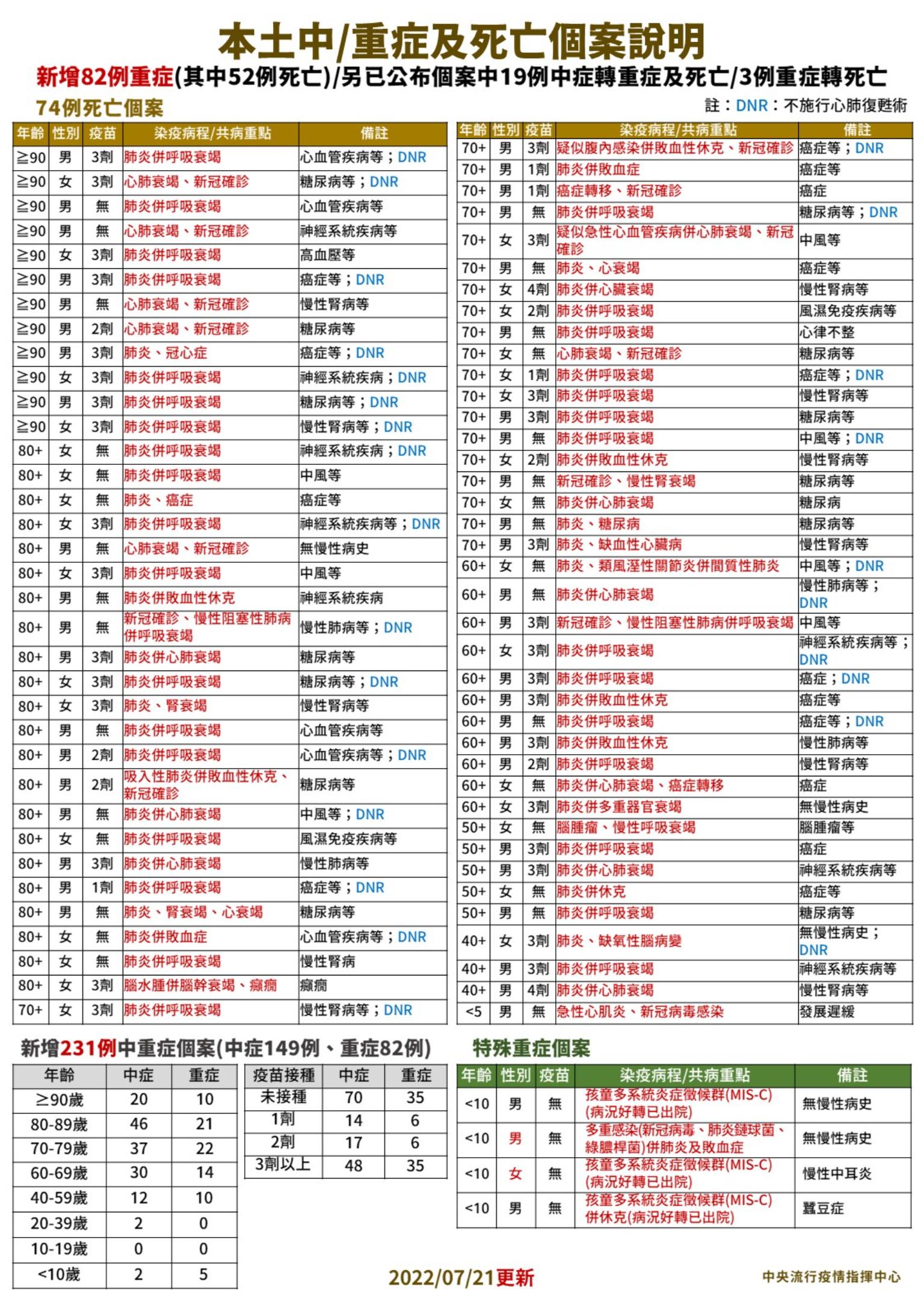 指揮中心指出,今日新增74例本土病例死亡個案,為43例男性、31例女性,年齡介於未滿5歲至90多歲以上,皆屬重度感染個案、71例具慢性病史、41例未接種3劑 COVID-19疫苗。確診日介於今(2022)年5月22日至7月19日,死亡日期介於5月22日至7月18日,詳如新聞稿附件。
