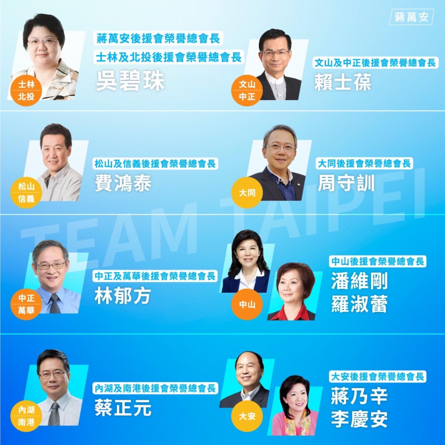 此外,前議長吳碧珠出任蔣萬安後援會榮譽總會長,前立委林郁方、周守訓、蔡正元、蔣乃辛、李慶安、潘維剛、羅淑蕾等,再加上賴士葆、費鴻泰,也將分別擔任蔣萬安各區後援會的榮譽總會長,替蔣逐一顧好每一個行政區。