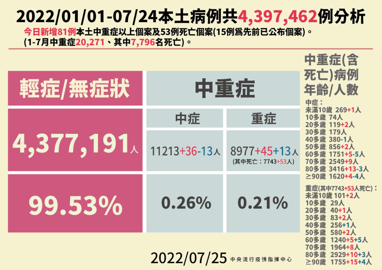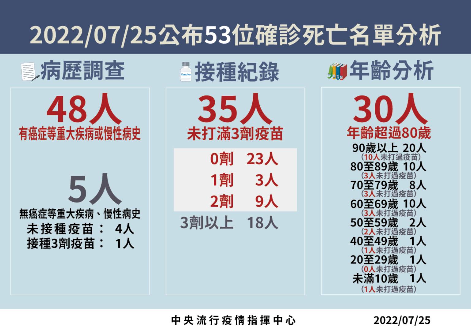 指揮中心指出,今日新增53例本土病例死亡個案,為29例男性、24例女性,年齡介未滿5歲至90多歲以上,皆屬重度感染個案、48例具慢性病史、35例未接種3劑 COVID-19疫苗。確診日介於今(2022)年6月1日至7月22日,死亡日期介於6月18日至7月23日,詳如新聞稿附件。
