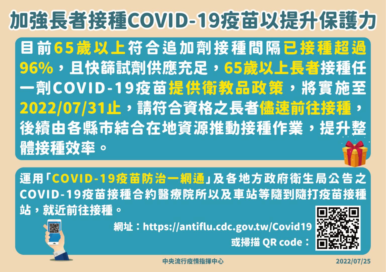 指揮中心再次呼籲,民眾應儘速完成疫苗接種,落實手部衛生、咳嗽禮節及佩戴口罩等個人防護措施,減少不必要移動、活動或集會,避免出入人多擁擠的場所,或高感染傳播風險場域,並主動積極配合各項防疫措施,下載及使用「臺灣社交距離APP」,共同嚴守社區防線。
