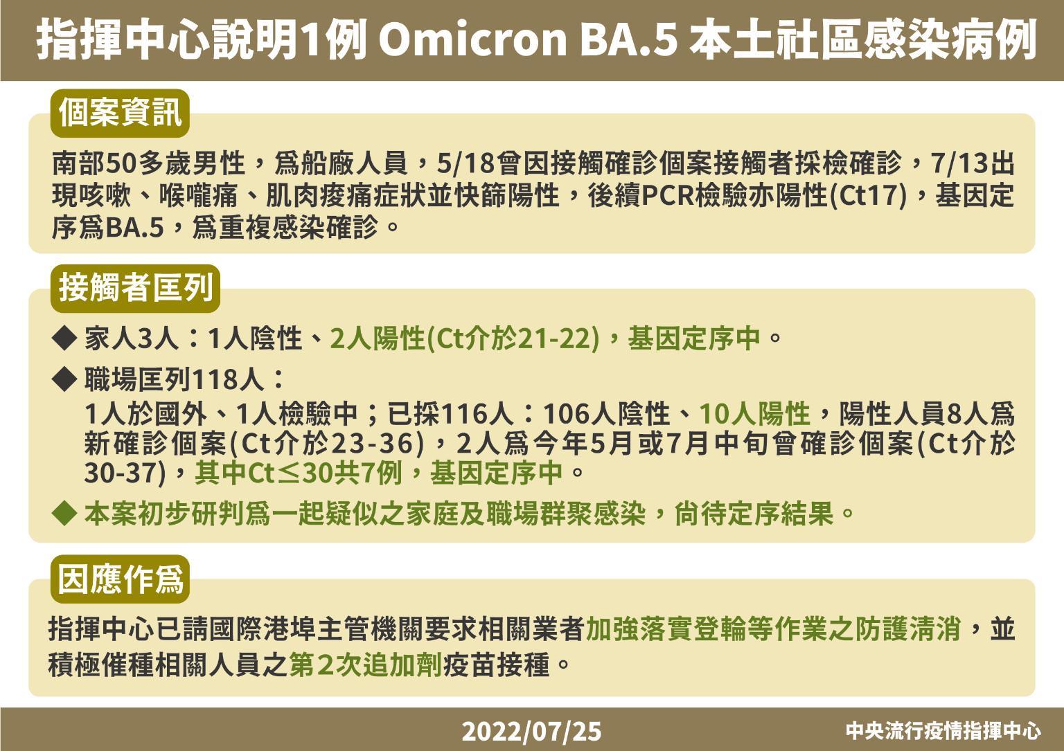 指揮中心說明,今日新增2例 Omicron亞型變異株BA.5本土個案,分別為60多歲及50多歲男性(以下稱案A及案B)。案A為家庭群聚感染,於今(2022)年7月5日至機場接送2名德國入境家人返家檢疫。其中1名家人於機場採檢陽性確診(為7月18日公布之 Omicron BA.5境外移入個案),案A列接觸者PCR檢驗陰性,採0+7自主防疫。7月13日因確診家人基因定序為BA.5,經安排案A及另1名同行家人(兩人均無症狀)採檢均陽性,基因定序均為BA.5。目前3名個案皆已隔離期滿,案A相關接觸者共12人,10人檢驗陰性,2人陽性(Ct>35)但均為今年5月或6月曾確診個案。