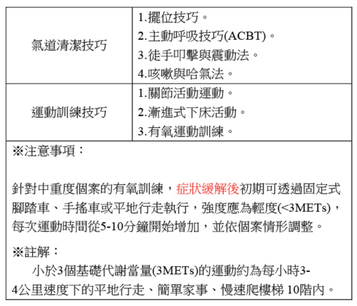 另外針對染疫後之中重度的兒童染疫患者,復健治療一般包含兩大面向,需要到醫院診所復健科求診,安排專業人員介入,如下表。