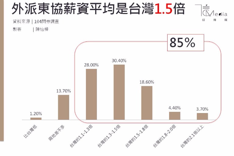 至於另一項更顯而易見的激勵工具當然就是「薪資」。觀察台資企業給予外派東協國家人員的薪資,平均下來約是台灣薪資的1.5倍,換句話說,若台灣的平均薪資是3萬9千元,外派東協人員的薪資平均就是5萬8500元,而且高達85%外派東協的職員薪資明顯都是高過台灣的薪水。