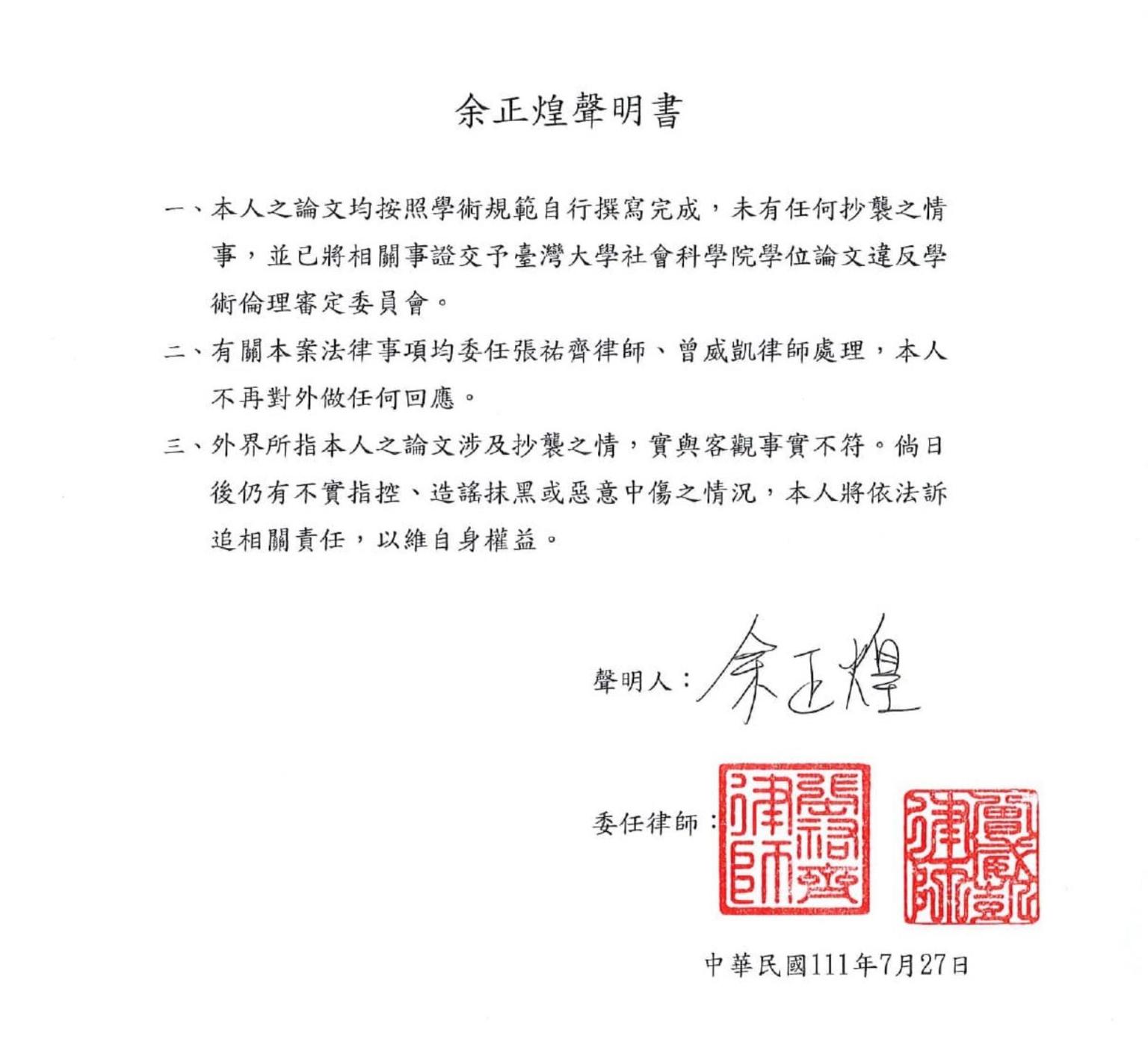 「論文門」事件演變成學術倫理與政治人物誠信的風暴,林智堅堅稱自己並未抄襲。而余正煌今日透過律師曾威凱發出聲明稱,他的論文都是依據學術規範自行完成,「沒有任何抄襲情事」,如外界仍有不實指控,將依法追究相關責任。