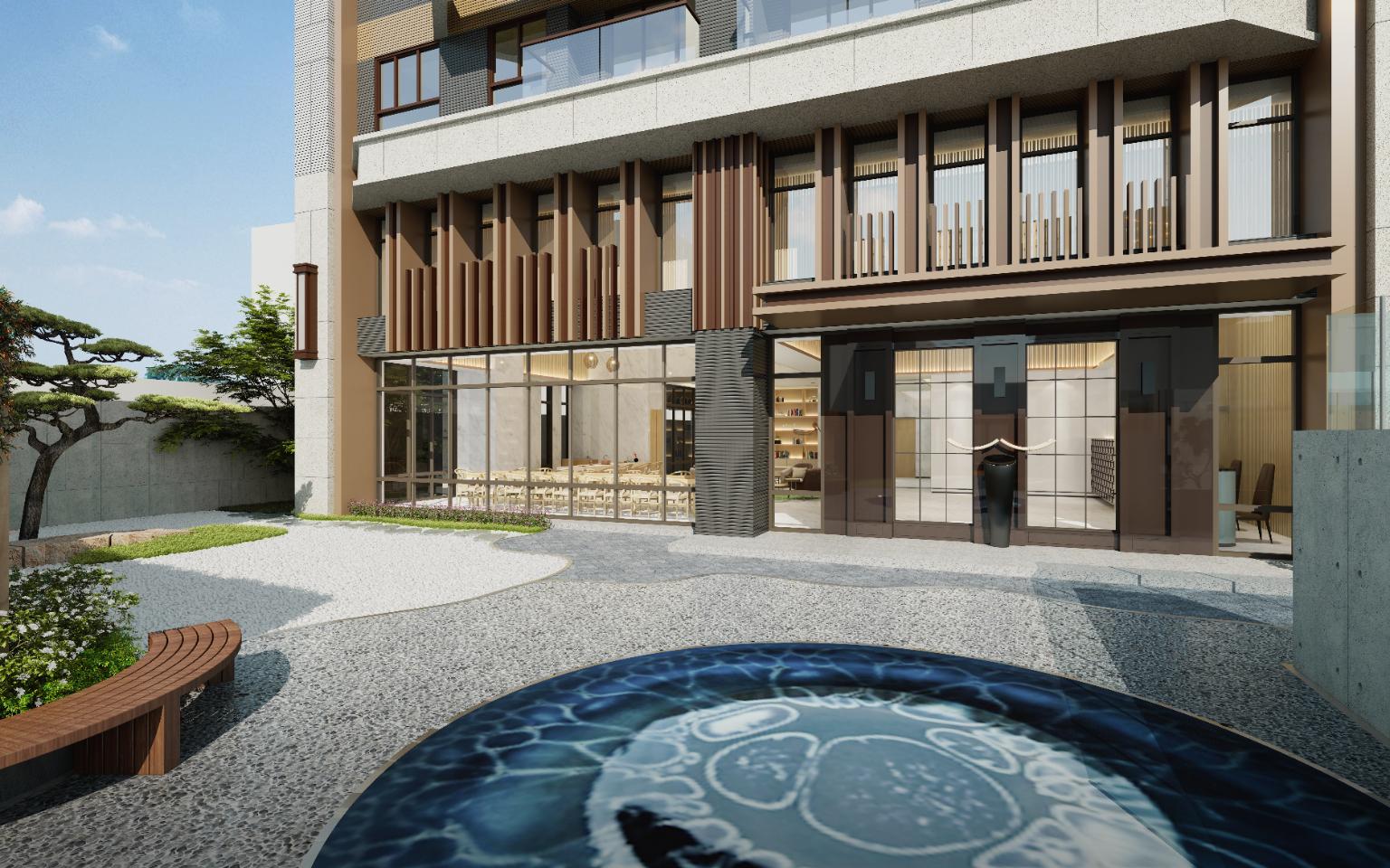 「常慶天目」基地面寬縱深;面寬約48米;縱深約28米,建物坐南朝北三面臨路15米中山路、11米中興路、11米中華路 , RC結構,設計成一個秘境住宅又別有洞天。為針對景觀及地景藝術,「天守閣」是「常慶天目」的主入口,推開牛軛特製門把,進迎賓大廳,鍍鈦金三色混搭,大廳白石材,搭配漢白玉水沖面,以不鏽鋼琺瑯燒烤莫蘭迪綠精品櫃檯,灰瓦搭配木紋格柵散發著濃濃和風美學「曼殊院」大門等等。
