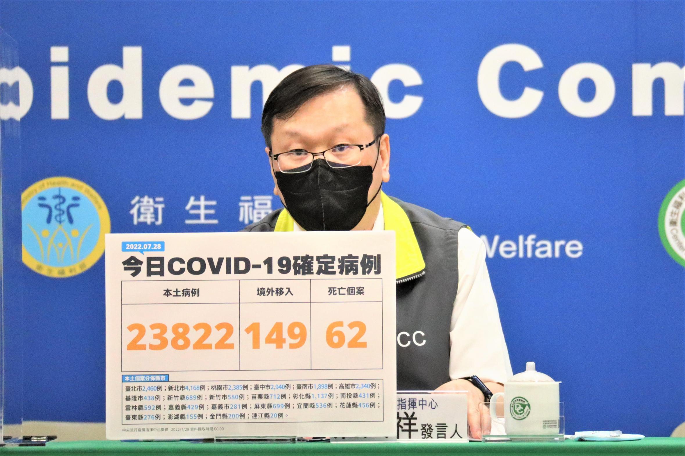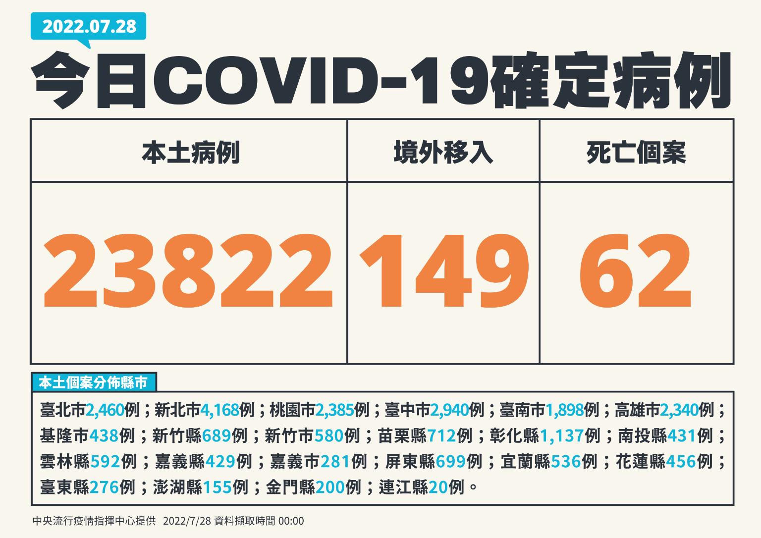 中央流行疫情指揮中心今(28)日公布國內新增23,971例COVID-19確定病例,分別為23,822例本土個案及149例境外移入;另確診個案中新增62例死亡。