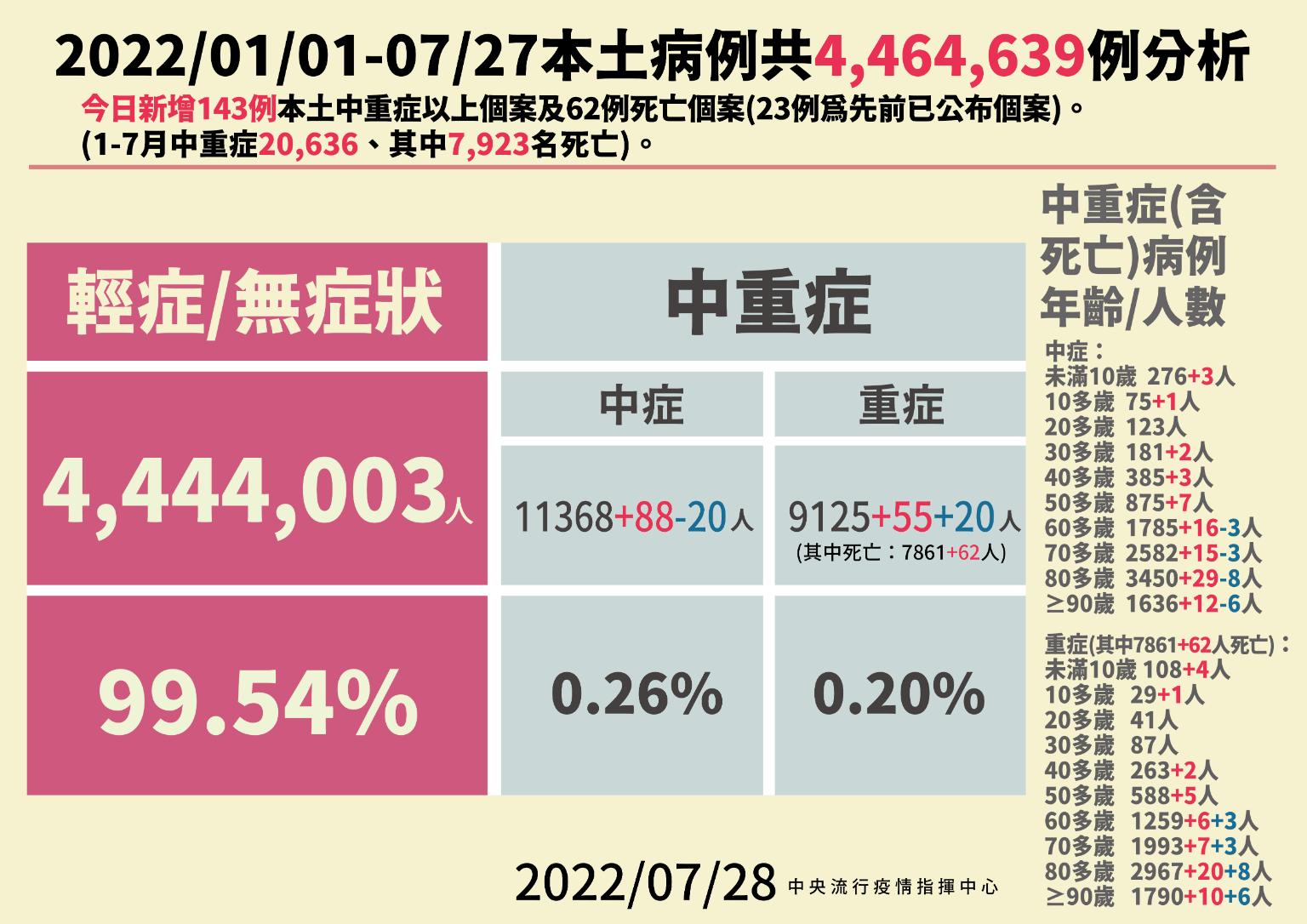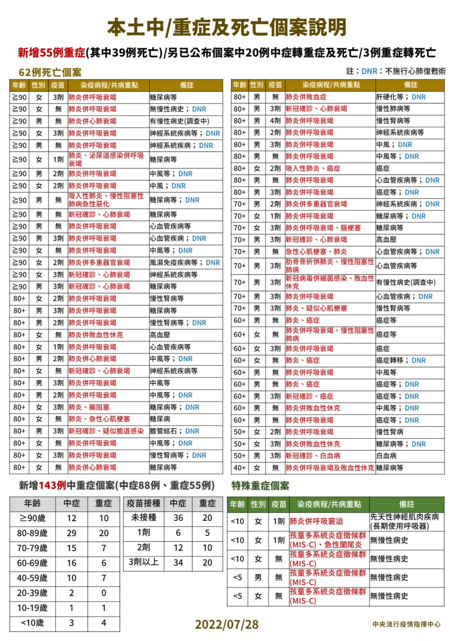 指揮中心指出,今日新增62例本土病例死亡個案,為36例男性、26例女性,年齡介於40多歲至90多歲以上,皆屬重度感染個案、61例具慢性病史、38例未接種3劑 COVID-19疫苗。確診日介於今(2022)年5月18日至7月25日,死亡日期介於6月5日至7月25日,詳如新聞稿附件。