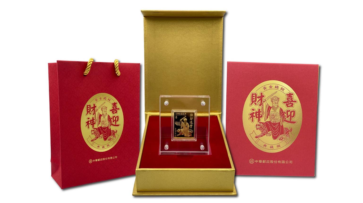 中華郵政公司於111年7月27日推出集郵商品「喜迎財神黃金鑄錠」2款,圖案係採用將於9月21日發行之「臺灣民間信仰郵票」面值8元武財神趙公明為設計,商品簡介如下: