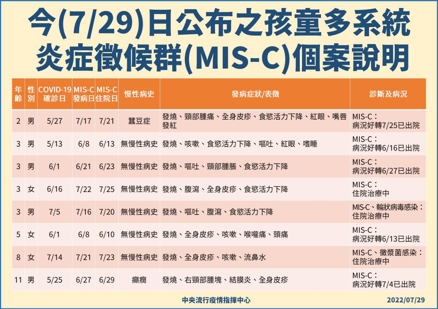 而今日新增的8例MIS-C中,8人在5月13日至7月14日間確診,6月8日至7月22日間發病,醫療應變組副組長羅一鈞指出個案症狀為發燒、腹瀉等,其中5人已出院、3人住院中,有1人合併輪狀病毒、另有1人合併肺炎黴漿菌感染,羅一鈞表示,這是國內首見MIS-C合併輪狀病毒以及肺炎黴漿菌案例。