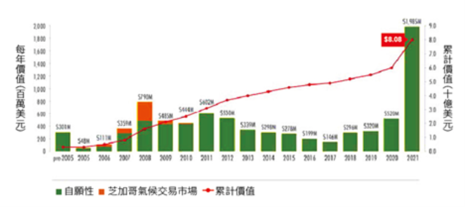 從2005年開始的自願性碳交易市場的變化,2021年打破過去的紀錄,達到近20億美元的市場規模。(圖片來源/方儉提供)
