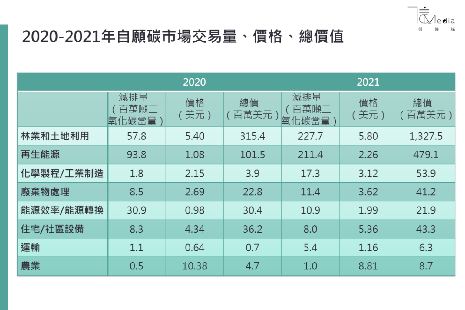 市場總值增長最大的,還是林業與土地利用,減排量增加了近4倍,單價也漲了4毛美元,其市佔率為6成8。農業雖然是最少的,但是碳交易的單價是最高的,2021年的平均單價下跌,是因為有大量的畜牧業沼氣減碳,價格低,把單價拉低了。