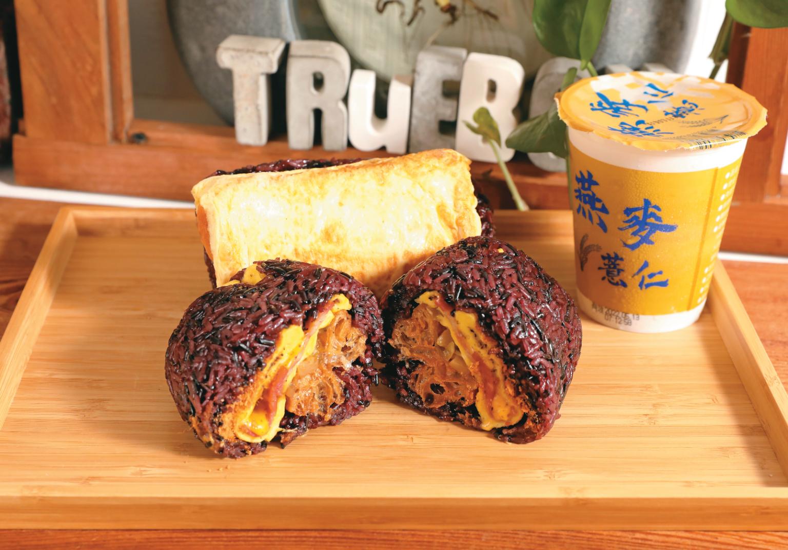 超越手掌大小的飯糰現點現包,帶給來客熱騰騰的暖意。紫米飯粒經過冷藏再行淘煮,入口即能感受如魚卵爆開般飽滿Q彈的口感,內餡主菜也富巧思,像是裹入日式照燒雞腿、西式培根起司蛋或台式蕃茄辣肉醬等多種口味,再搭配熱呼呼的酥脆油條、花生粉、酸菜、菜脯,組合起來好吃又不膩;新推出的「法式蹦啾」,最外層包覆金黃的法式吐司,提供在中式或西式早餐猶疑的人一個兩全其美的選擇,一口咬下各種令人驚豔的可能,為旅行增添滿滿能量。