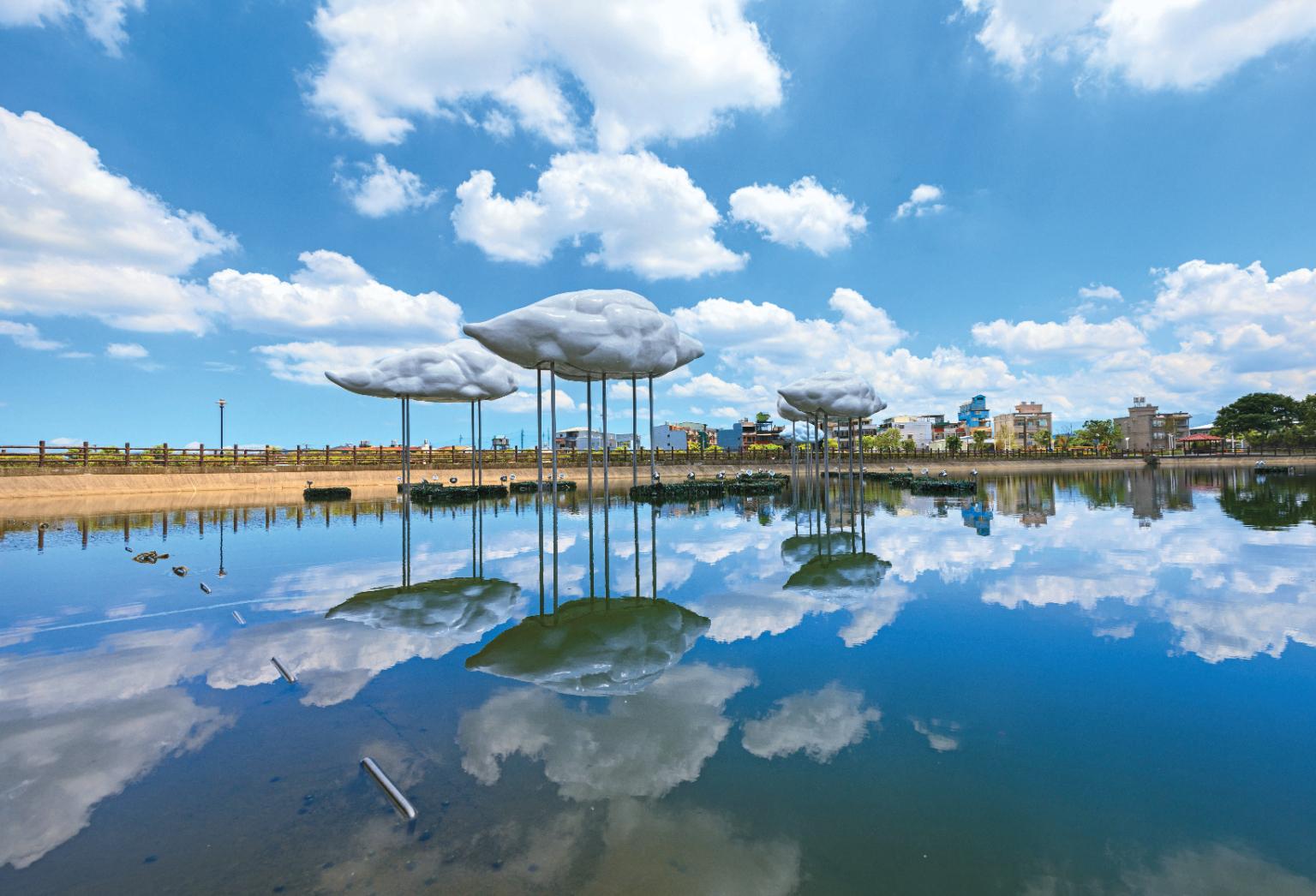 筆直的跨埤步道將埤塘劃分兩半,西池設置了2019年桃園地景藝術節的作品「歡聲笑語」,雲朵般的裝置藝術凌空飄浮在漣漪微微的水面上,構成一幅童趣可愛的景致,沿著池子興建的環池步道上則栽植欒樹,夏日滿樹翠綠令人屏息;東池視野開闊,池畔木棉滿植,蒴果成熟時棉絮滿天飛舞。趁豔陽尚未高照,漫步城市鬧中取靜的埤塘綠地,欣賞天光水色風景,揮別煩心的日常瑣事。