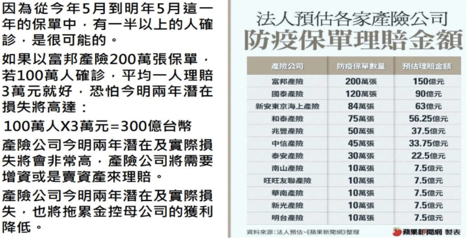 我們原本以為,今年5月到明年5月可能染疫保單理賠機率將會高達5成,以理賠3萬元計算,將使各家產險公司從今年到明年產生大幅的理賠金額,會比法人預估的還高,如下表一所示;然而,若以新安東京產險的防疫保單不到90萬張就預估將慘賠290億,那麼比新安東京產險更多防疫保單的其他產險及壽險公司不就更慘?