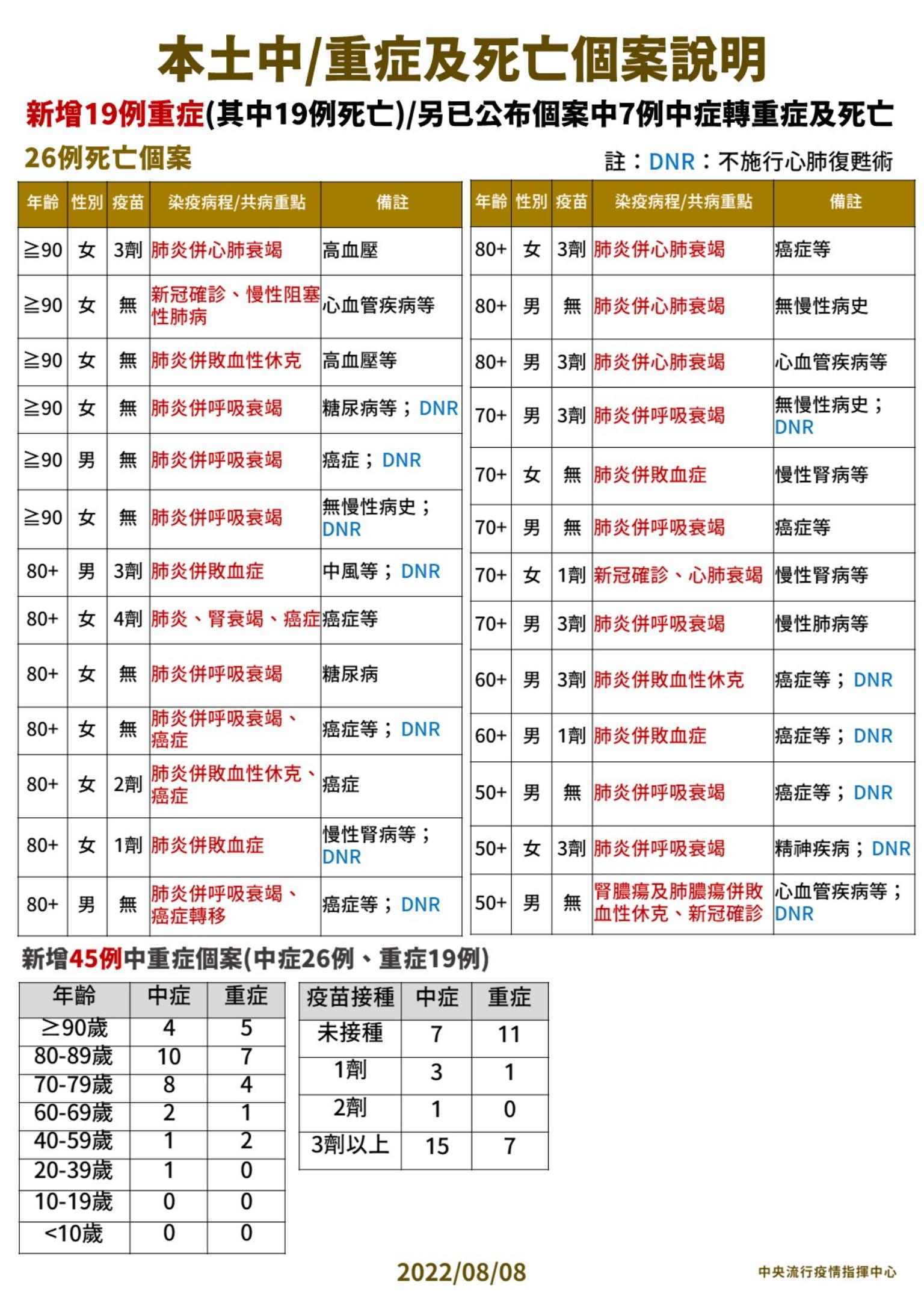 指揮中心指出,今日新增26例本土病例死亡個案,為12例男性、14例女性,年齡介於50多歲至90多歲以上,皆屬重度感染、23例具慢性病史、17例未接種3劑COVID-19疫苗。確診日介於今(2022)年5月16日至8月6日,死亡日期介於6月17日至8月6日,詳如新聞稿附件。
