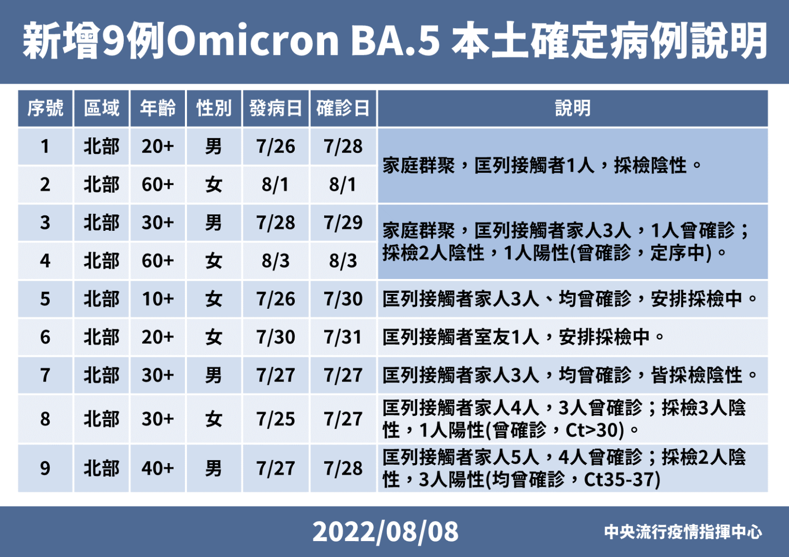 指揮中心說明,今日新增9例Omicron亞型變異株BA.5本土個案,均位於北部,為4名男性、5名女性,年齡介於10多歲至60多歲,發病日介於7月25日至8月3日,確診日介於7月27日至8月3日。其中4人為2起家庭群聚案,衛生單位已啟動疫情調查並匡列相關接觸者,目前共匡列20人,其中11人陰性、5人陽性,餘安排採檢中。